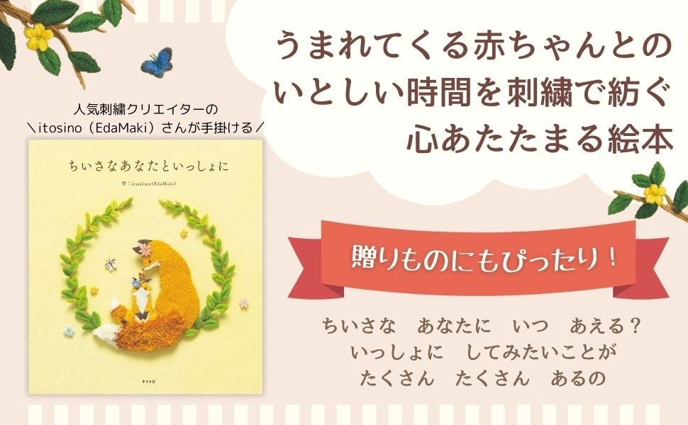 人気刺繍クリエイターitosino・EdaMakiさんが手掛ける刺繍の絵本です。物語の主人公はitosinoのアイコン的モチーフであり、ファンの方にも人気の「きつね」の親子。これからうまれてくるわが子と過ごす未来の日々を思い描いた物語で、母になる喜びといとしさ、そして少しの不安にも寄り添ったあたたかい一冊となっています。家族や友人など、大切な方の妊娠・出産のお祝いにもぴったりです。