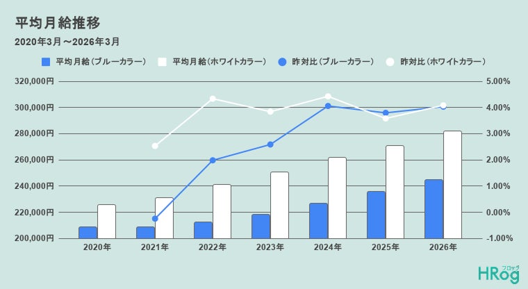 ブルーカラーの平均月給は、2020年3月2日時点で208,770円、2026年3月2日時点で244,802円となり、6年間の伸び率は+17.26%です。ホワイトカラーの平均月給は、2020年3月2日時点で225,434円、2026年3月2日時点で281,938円で、6年間の伸び率は+25.06%となりました。