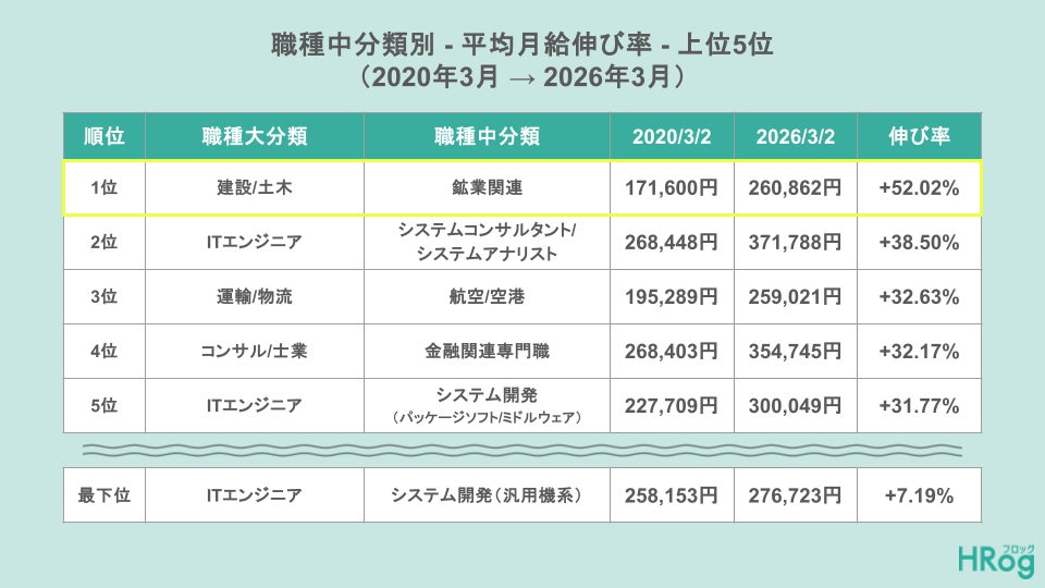 続いて、より細かい分類である職種中分類のデータを見ていきます。2020年から2026年の6年間の平均月給伸び率は、ブルーカラーである「建設/土木/エネルギー」の中から「鉱業関連」が1位となりました。+52.02%と6年間で平均月給が約1.5倍になっています。