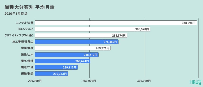 職種大分類とは、職種を大きく分類した区分です。職種大分類別に2026年3月2日時点の平均月給を確認すると、全体としてホワイトカラーの職種の方が平均月給が高く、1位は「コンサル/士業」です。他職種と比べ飛びぬけて高い水準で、月給は35万円近くに達します。