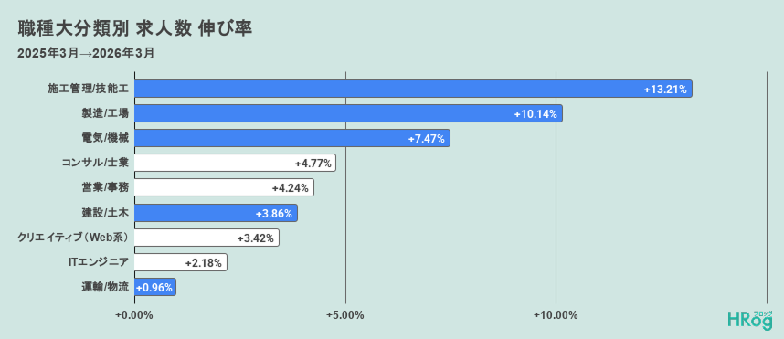 求人数を2025年3月から2026年3月までの伸び率で比較してみると、1位は「施工管理/技能工」で+13.21%、2位が「製造/工場」で+10.14%、3位が「電気/機械」で+7.47%と、ブルーカラーの職種が上位3つを占めています。