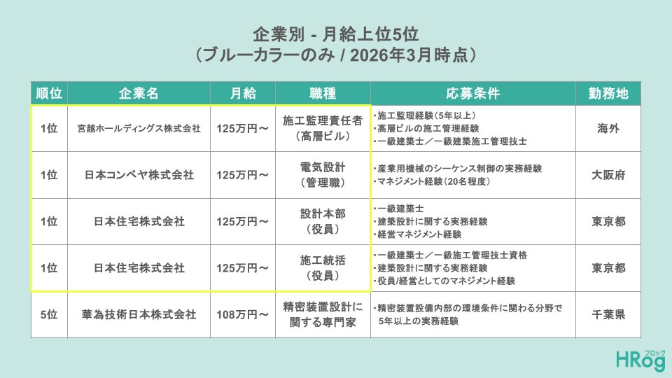 - 月給125万円以上の求人が3社!ブルーカラーで平均月給を引き上げている企業は?