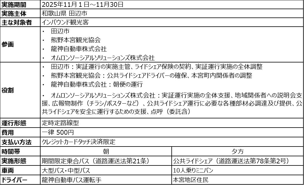 オムロン ソーシアルソリューションズ株式会社(本社: 東京都港区、代表取締役社長:四方 克弘、以下OSS)は、2025年11月1日から和歌山県・田辺市で、公共ライドシェアサービスの導入に向けた実証運行を行います。本取り組みは、観光シーズンでの交通空白解消および移動活性化に向けた取り組みとなります。