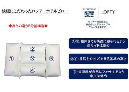 2層構造(しっかりめ/やわらかめ)なので、お好みの感触を選べます。仰向き・横向きの寝姿勢を考慮した、ロフテー独自の5分割構造で寝返りがスムーズにできて頭と首が心地よくフィット。寝ている間も素材が偏らないので、朝まで理想的な寝姿勢が保てます。