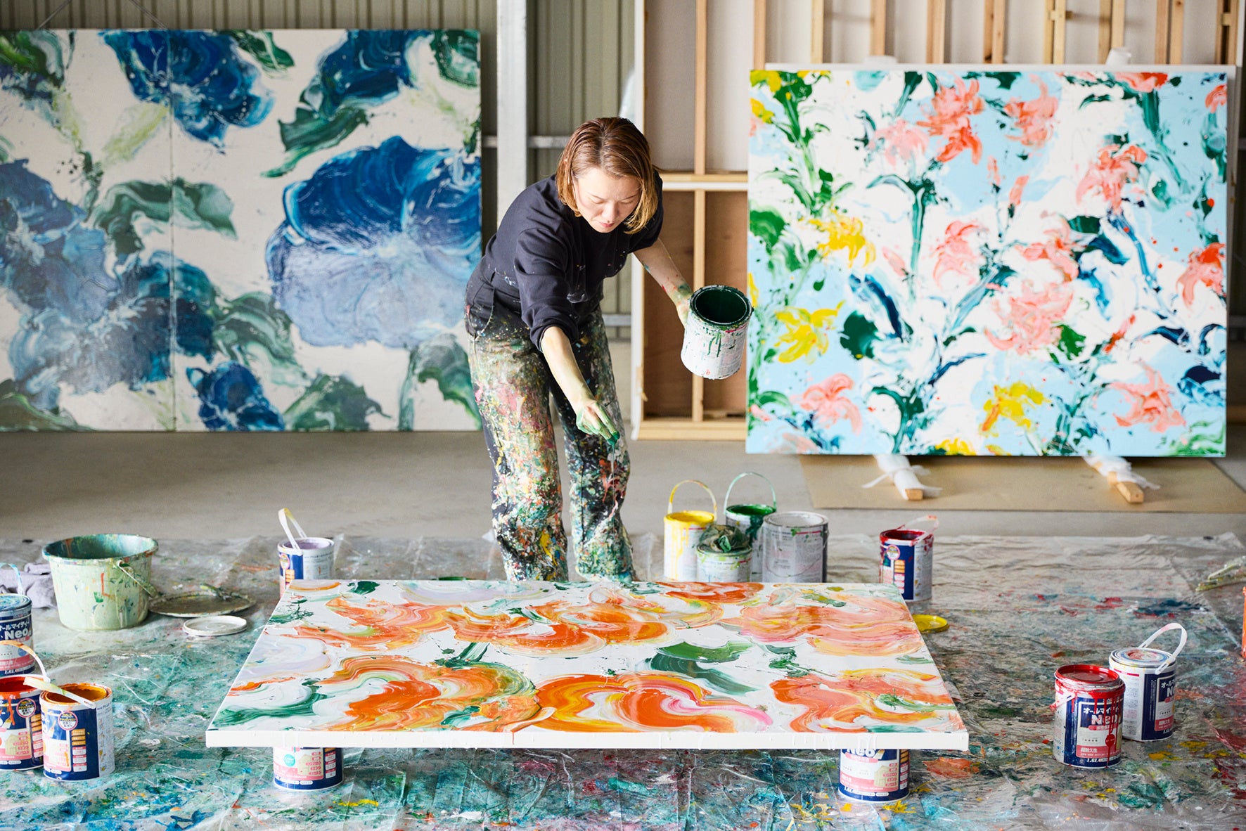 木下作品の最大の特徴は、筆を用いず手や腕で描く独自のスタイルにあります。手のひらでたっぷりとすくい取った絵具をキャンバスへと運び、時に素早く、時にゆったりと、手や腕を滑らせながら色彩の流れを紡いでいきます。