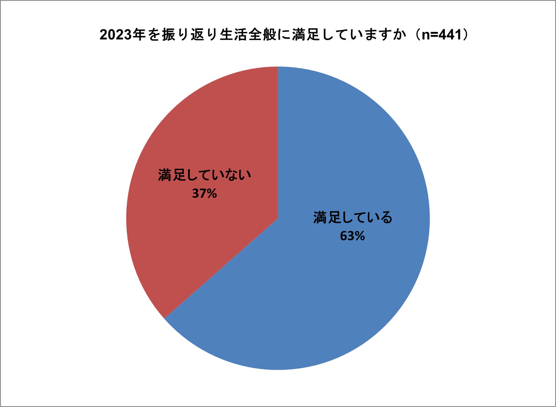 2023年生活全般の満足度については、63%が「満足」、37%が「満足していない」と回答しています。新型コロナウイルス感染症が5類移行となり行動範囲が広がった反面、円安などによる物価高が生活に大きな影響をあたえています。2022年の調査と比較しても「満足している」は4ポイント減少しています(※1)。