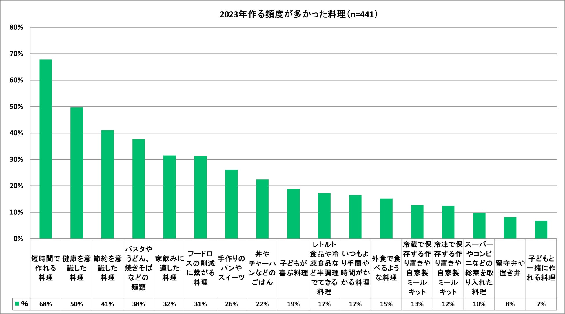 ・2023年作る頻度が多かったのは「短時間で作れる料理(68%)」、次いで「健康を意識した料理」が50%