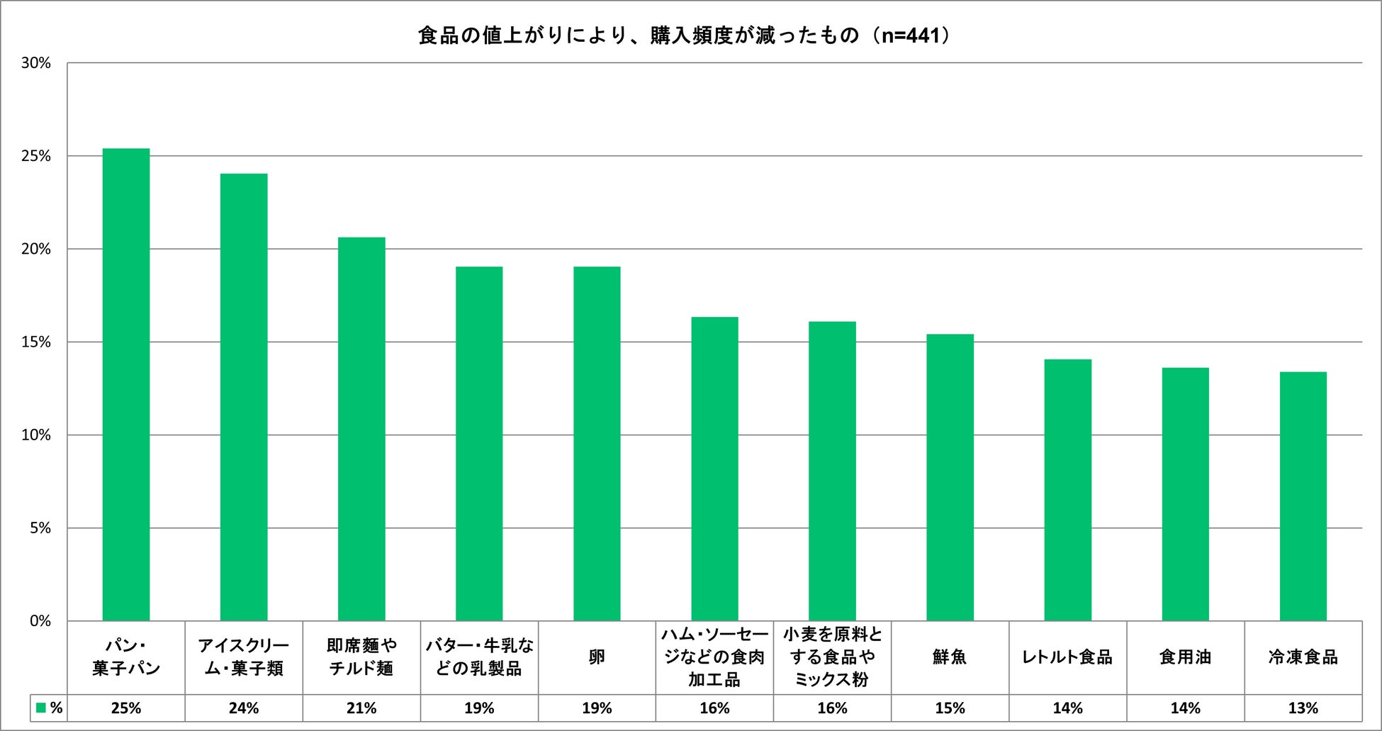 購入頻度が減った食品については「パン類(25%)」「菓子類(24%)」「麺類(21%)」が上位となりました。必需性が低めの食品が買い控えの対象になっています。