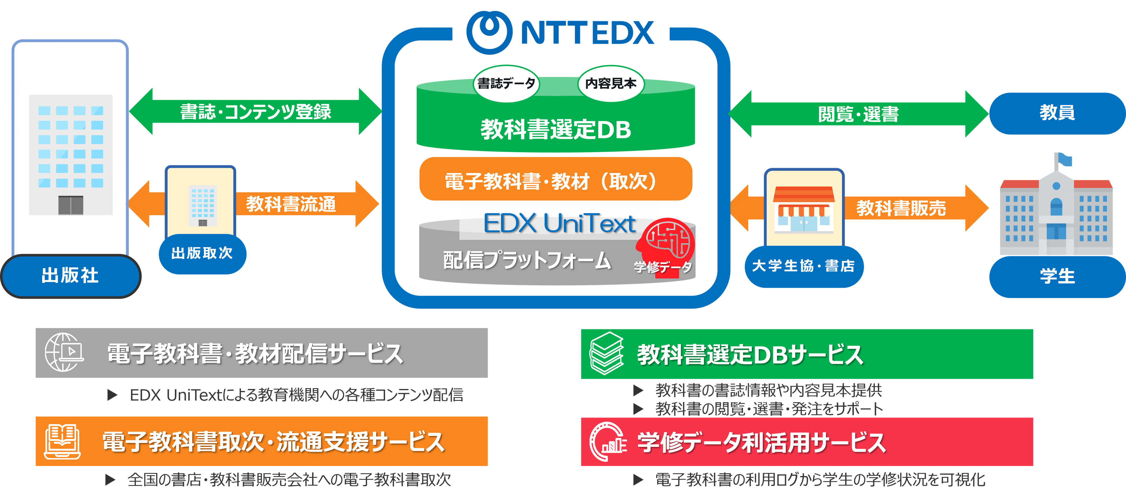 NTT EDXを中心に、書店が商品を管理・販売できる構造を実現し、教育コンテンツ流通の基盤を整備しました。