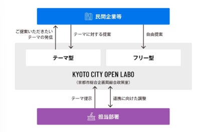 「KYOTO CITY OPEN LABO」は、社会課題の解決に向けた民間事業者からの提案を受け付ける、公民連携の窓口です。受け取った提案をもとに、事業者と市役所各部署との橋渡し役となり、実現に向けてサポートを行っています。