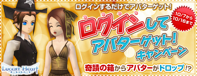 「神無月アバタープレゼントキャンペーン」では、条件を満たした方にもれなく、ゲーム内アバターをプレゼントいたします。キャンペーンに参加し、おしゃれに着替えて「ルーセントハート」をお楽しみください。