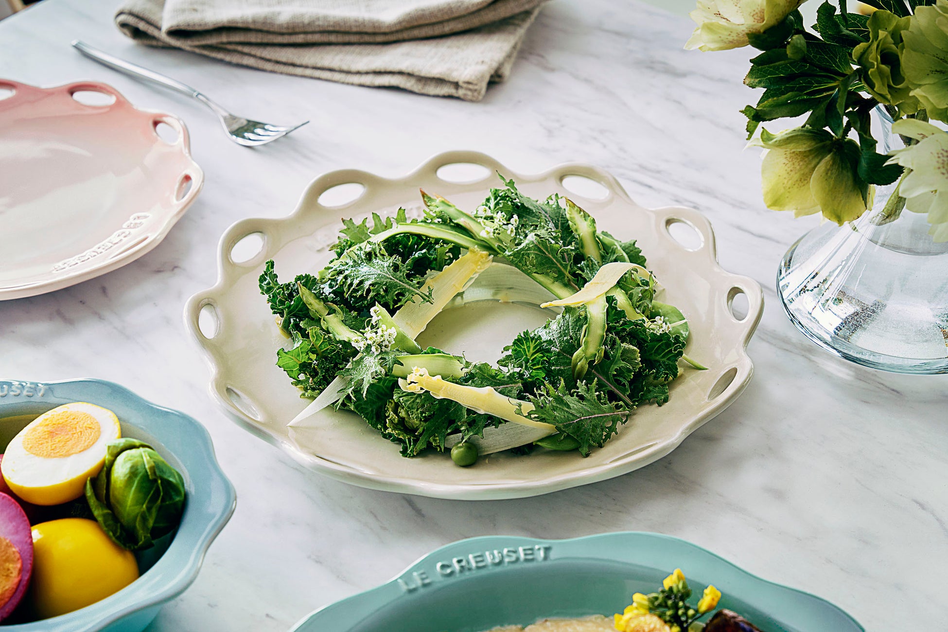 春はアスパラガスやスナップエンドウなど、おいしい野菜がたくさん出回る季節です。旬の野菜が手に入ったら、まずはシンプルにサラダでいただきましょう。この日はグリーンとホワイト、2色のアスパラガスをサッと茹でてスライサーで薄切りにし、葉物野菜と合わせたサラダに。いつものサラダも、リース状に盛りつけるなどアイデア次第で、アートのように美しいおもてなしのメニューに仕上がります。盛りつけには、程よく立ち上がったリムのアイレットが印象的な「フルール・レース・プレート 25cm」をチョイス。レースのようなアイレットが食材の美しさを引き立て、軽やかな春の風をテーブルに運んでくれます。