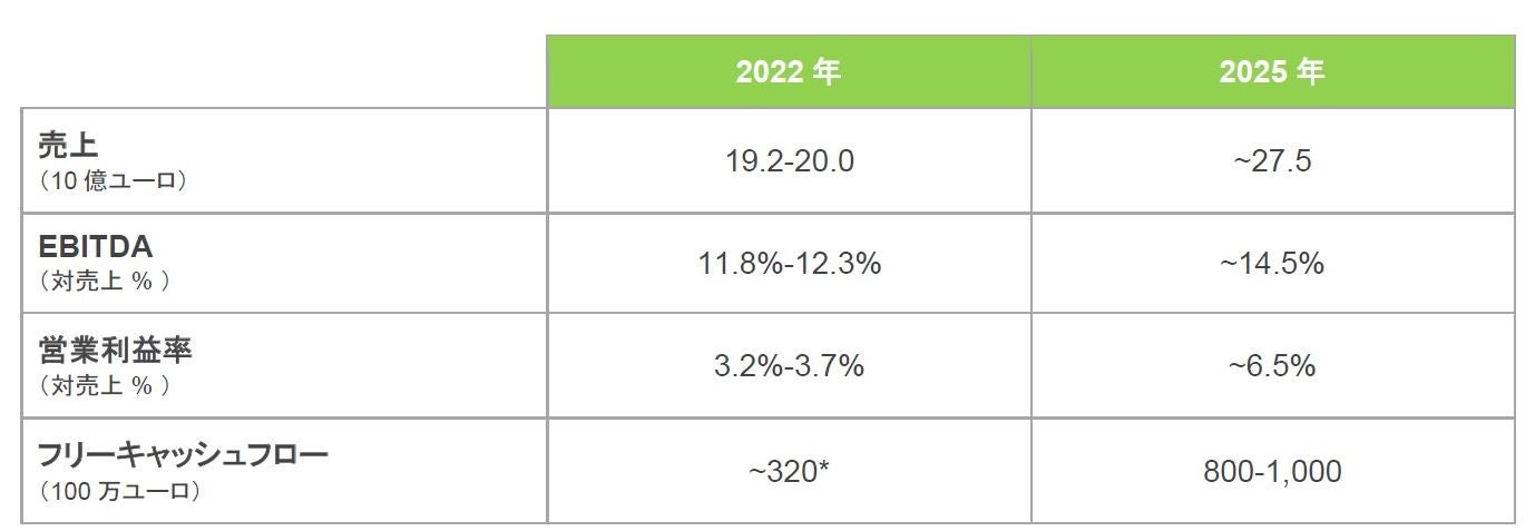 原材料とエネルギーの価格が高騰する中、グループは2025年までにEBITDAマージンと営業利益率をそれぞれ売上高の約14.5%と6.5%に引き上げることを目指しています。ちなみに2021年は、それぞれ13.4%と4.0%でした。
