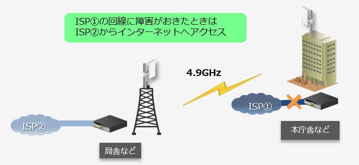 災害に備えた4.9GHz帯の無線バックアップ回線としてのご利用イメージです。