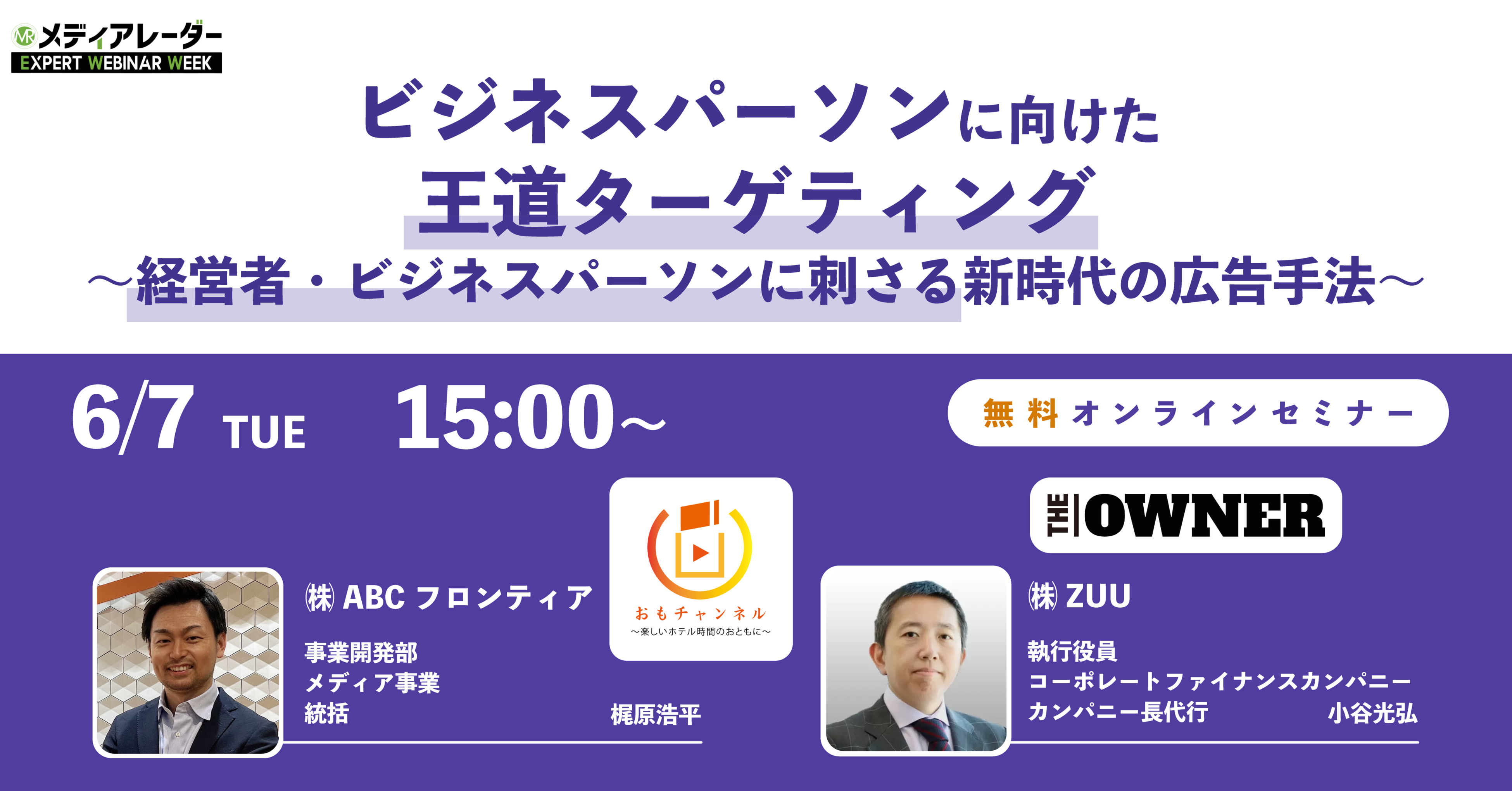 - 「ビジネスパーソンに向けた王道ターゲティング~経営者・ビジネスパーソンに刺さる新時代の広告手法~」6月7日(火)15:00~