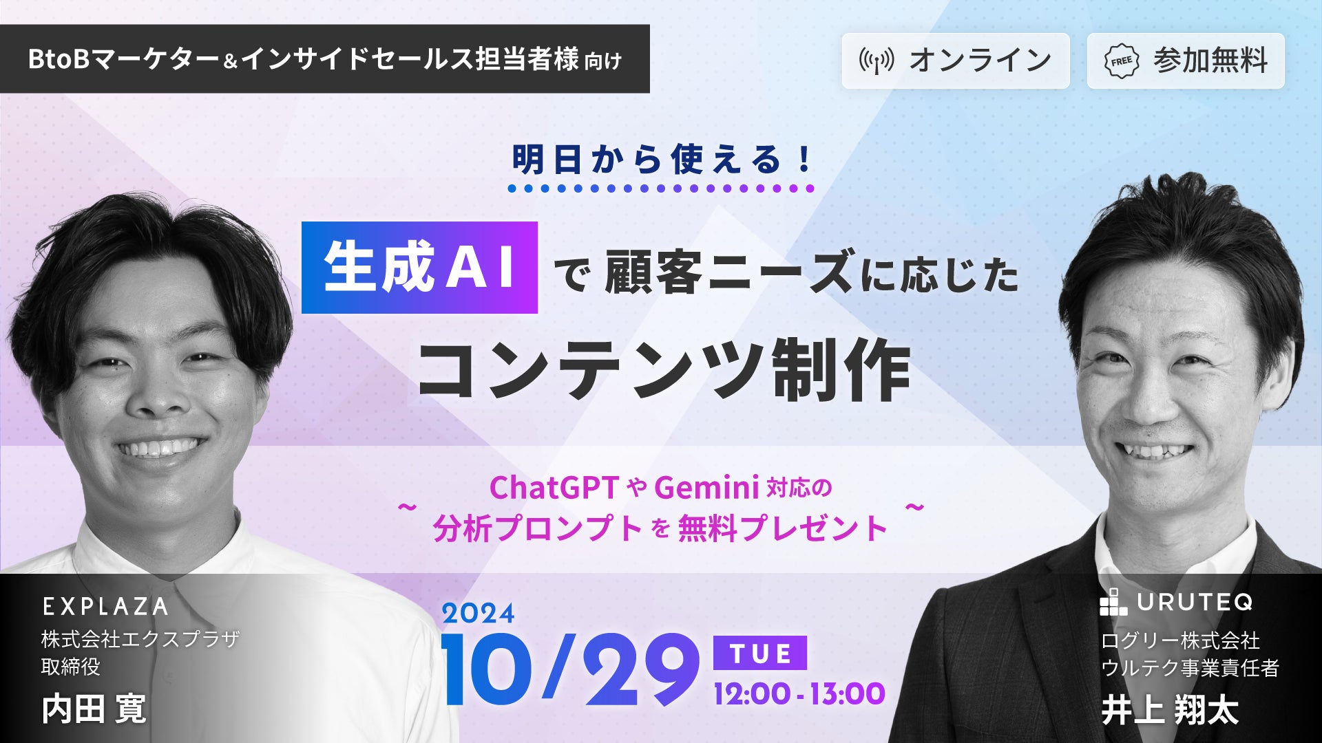 アカウントインテリジェンスツール※1『ウルテク』を提供するログリー株式会社(本社:東京都渋谷区、代表取締役:吉永浩和、証券コード:6579、以下、ログリー)と生成AI活用のコンサルティングから開発までを一気通貫で支援する株式会社エクスプラザは、「【明日から使える】生成AIで顧客ニーズに応じたコンテンツ制作を開催」というテーマの無料のオンラインウェビナーを開催します。