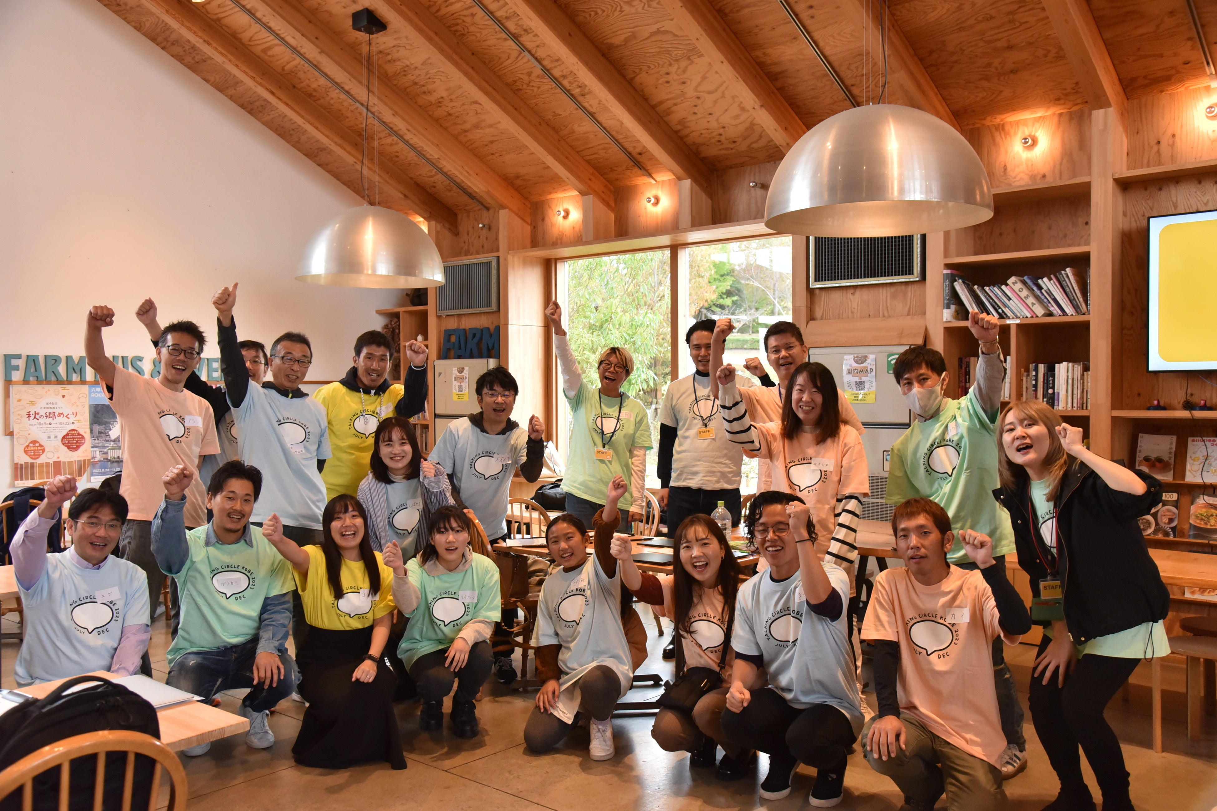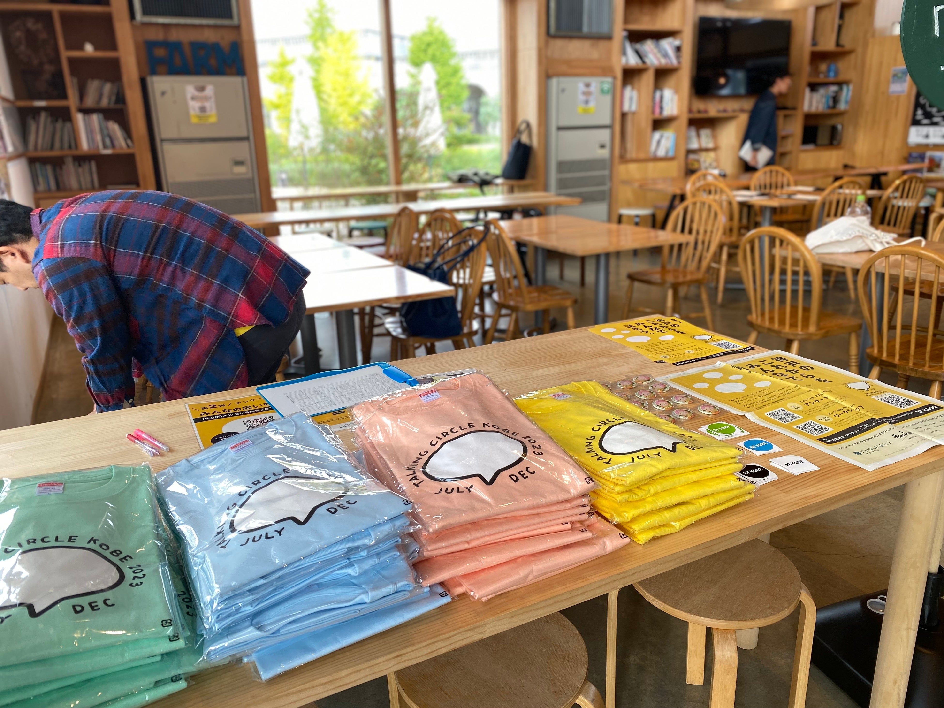 参加者は地元の有馬温泉に住んでいる人、ファームサーカスに野菜を卸している農家さんから、京都出身の人まで幅広く参加した18人。それぞれ、4色ある「トーキングサークルコウベ)2023」Tシャツの中から好きな色を選んで着用し、3グループに分かれてワークショップが始まりました。
