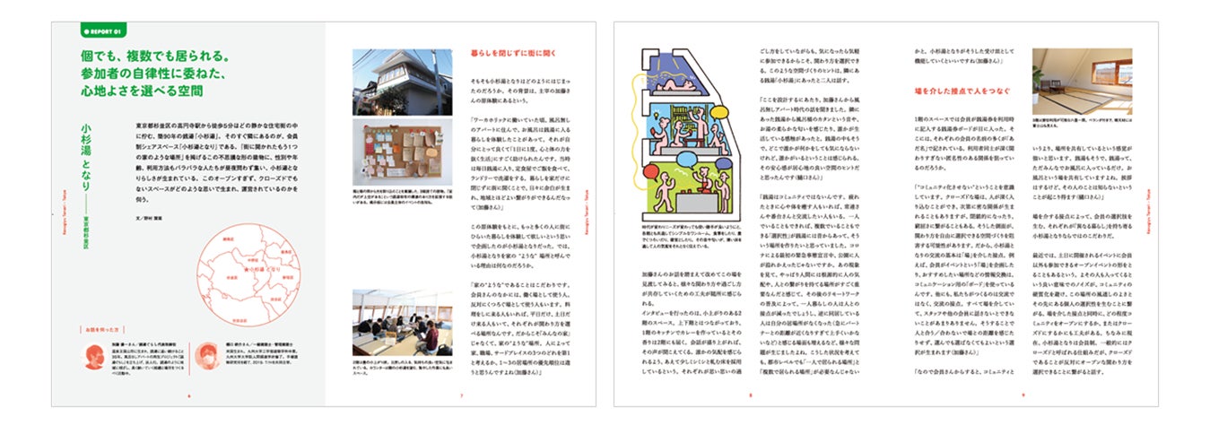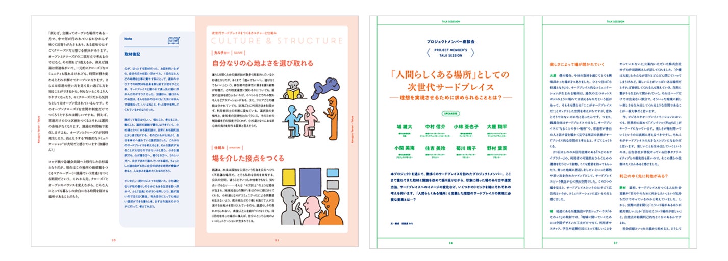 今回発刊した『POWER OF 3rd PLACE』では、“次世代サードプレイス”を現代の価値観を先取りして体現している「新しい社会のあり方を最小単位で試す場所」と考え、冊子を編集しました。取材をした東京都杉並区の「小杉湯となり」など注目を集めている5つのサードプレイスを深掘りしています。どんな思いから生まれて運営されている場所なのかを関係者へのインタビューをもとにまとめているほか、その場所の“カルチャー(文化)”と“仕組み(カルチャーを実装するための構造)”の相互作用についても考察しています。巻末には8人の次世代サードプレイスラボ メンバーによる座談会を公開。数多くのサードプレイスを訪れる中で印象に残った場や理想的なサードプレイスの実現に必要な要素など、これまでを振り返りながら語り合いました。