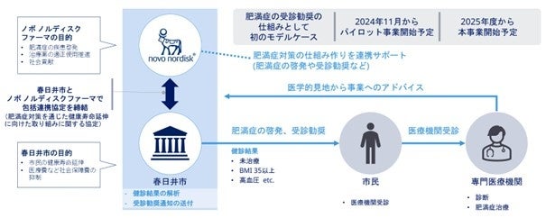本協定は、ノボ ノルディスク ファーマおよび春日井市が連携・協力を行うことを通じて、春日井市における肥満症対策の構築および市民の健康寿命延伸を図ることを目的としています。具体的には人間ドックや特定健診の結果において、肥満症の一定基準を満たす対象者に対し、保健指導などを通じて肥満症専門医療機関への受診を促すとともに、市民に対する肥満症の疾患啓発を行うことで、疾患に対する正しい知識の普及に取り組みます。