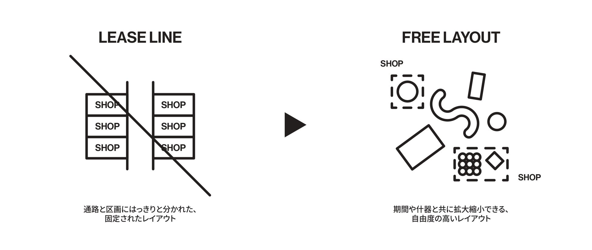 また、極力壁を建てずに、空間を創ることで、従来商業施設のリースライン方式での出店スタイルを取払い、フロアにいる利用者も出店者もシームレスに繋いでいきます。
