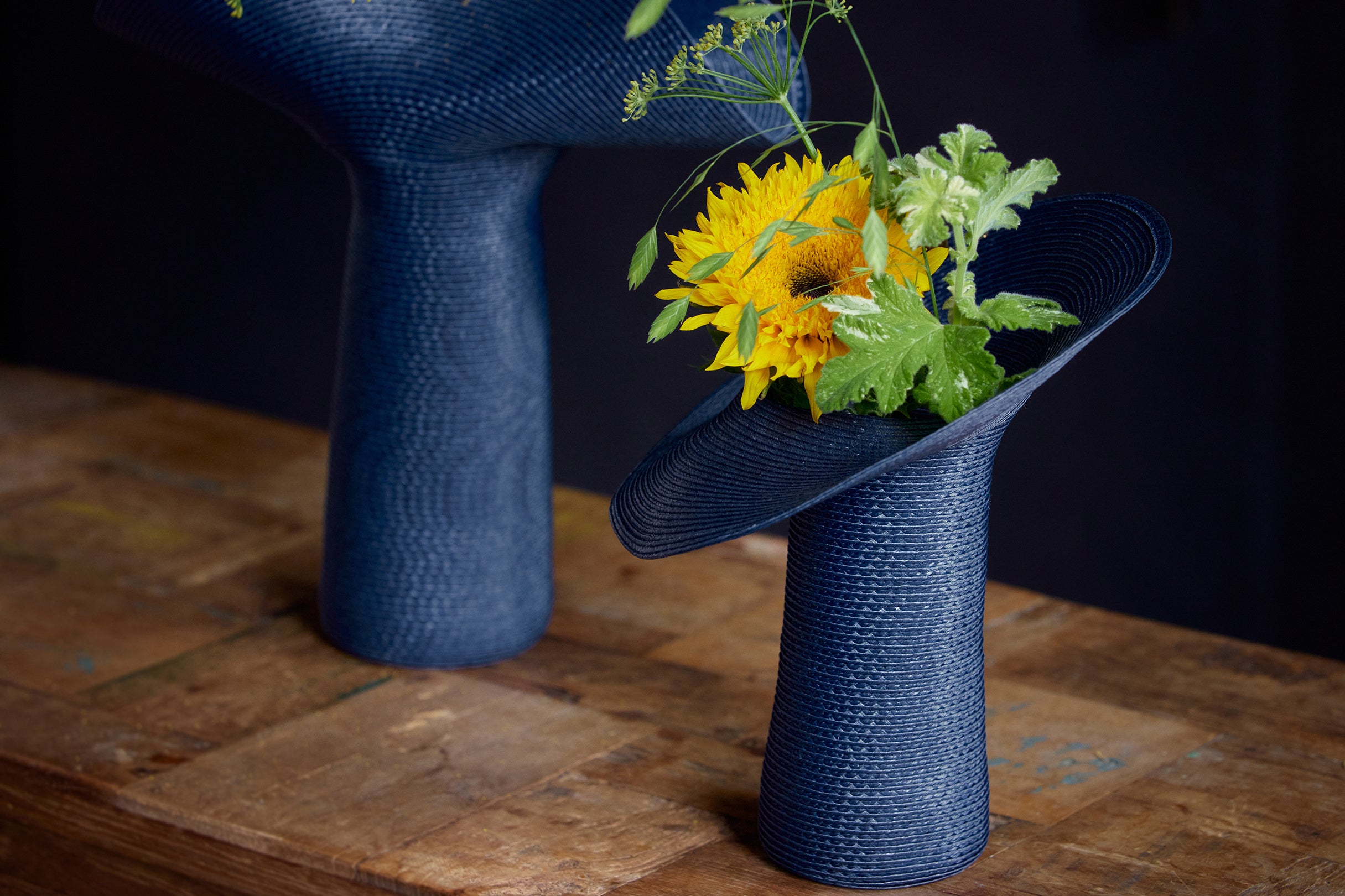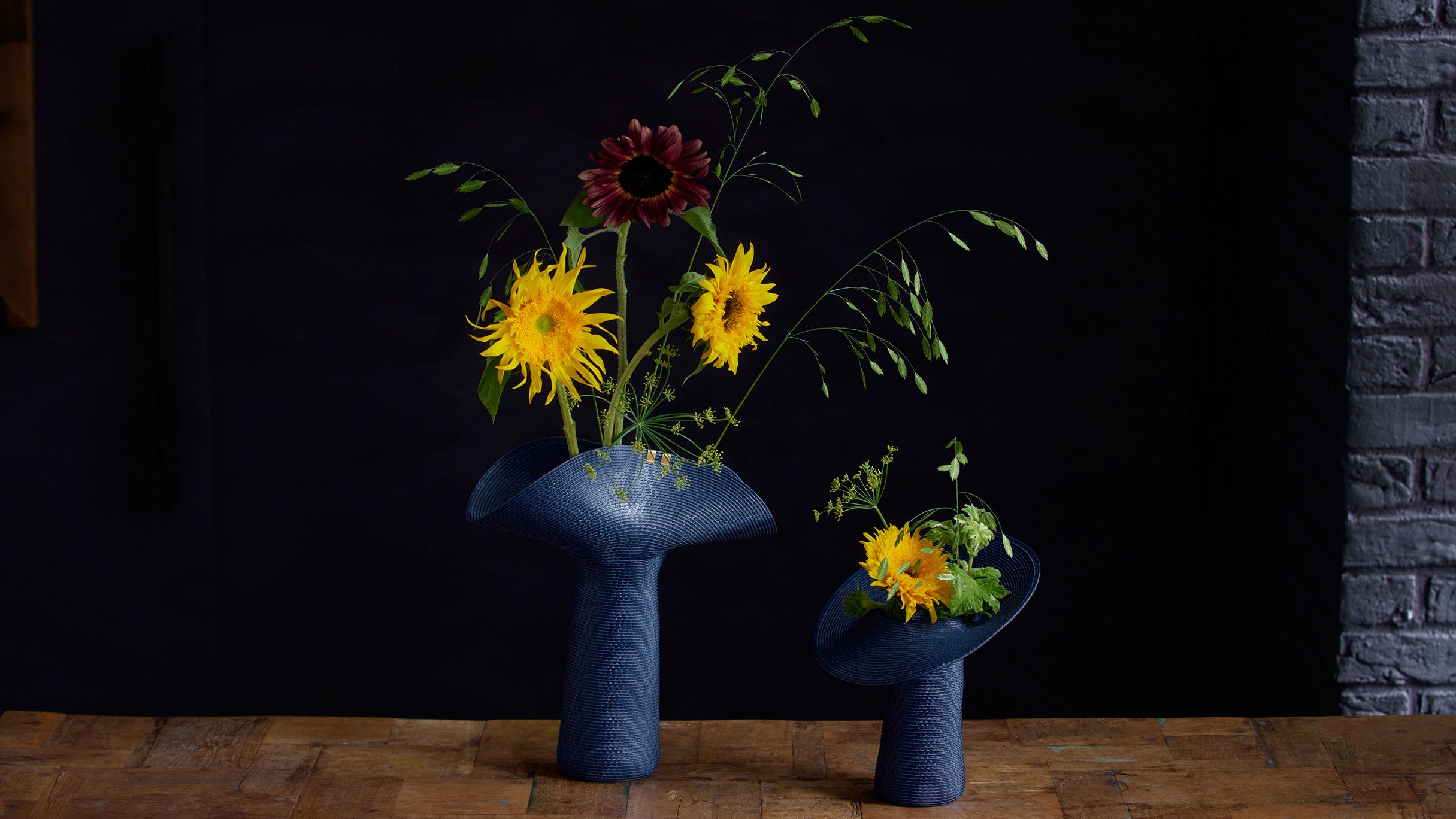 フローリストがセレクトしたフラワーベースがおよそ1,000種揃う、青山フラワーマーケット 南青山本店2階にある「フラワーベースギャラリー」。今回の青山ヒマワリ祭りに合わせて、ヒマワリカラーが映えるブルーのフラワーベースを集めて販売します。飾りやすい一輪挿しから、涼し気なガラスベースの他、春の青山バラ祭りで人気だった帽子型のフラワーベース「MOBJE(モブジェ)」からは青山フラワーマーケットの限定カラーが登場します。