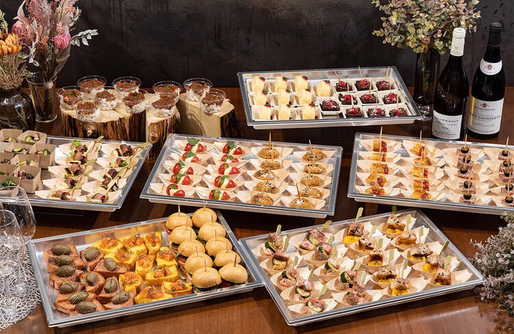 立食パーティーでも食べやすいピンチョスで構成されたプランで、お酒やおしゃべりをしながら、料理をお楽しみいただけます。丁寧にひとつひとつこだわりのソースや味付けで仕上げられ、本格的なお店の味がデリバリーでご堪能いただけます。
