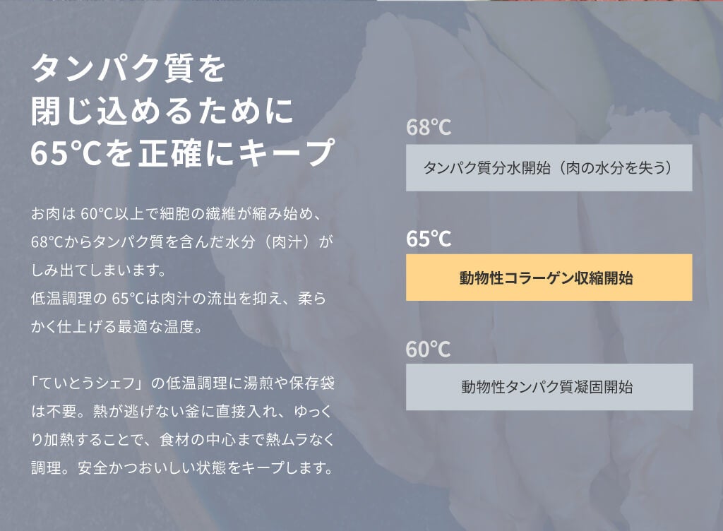 料理初心者、一人暮らしで調理道具が揃っていないという方にも簡単に低温調理を楽しんでいただけるのが多機能炊飯器「ていとうシェフ」です。