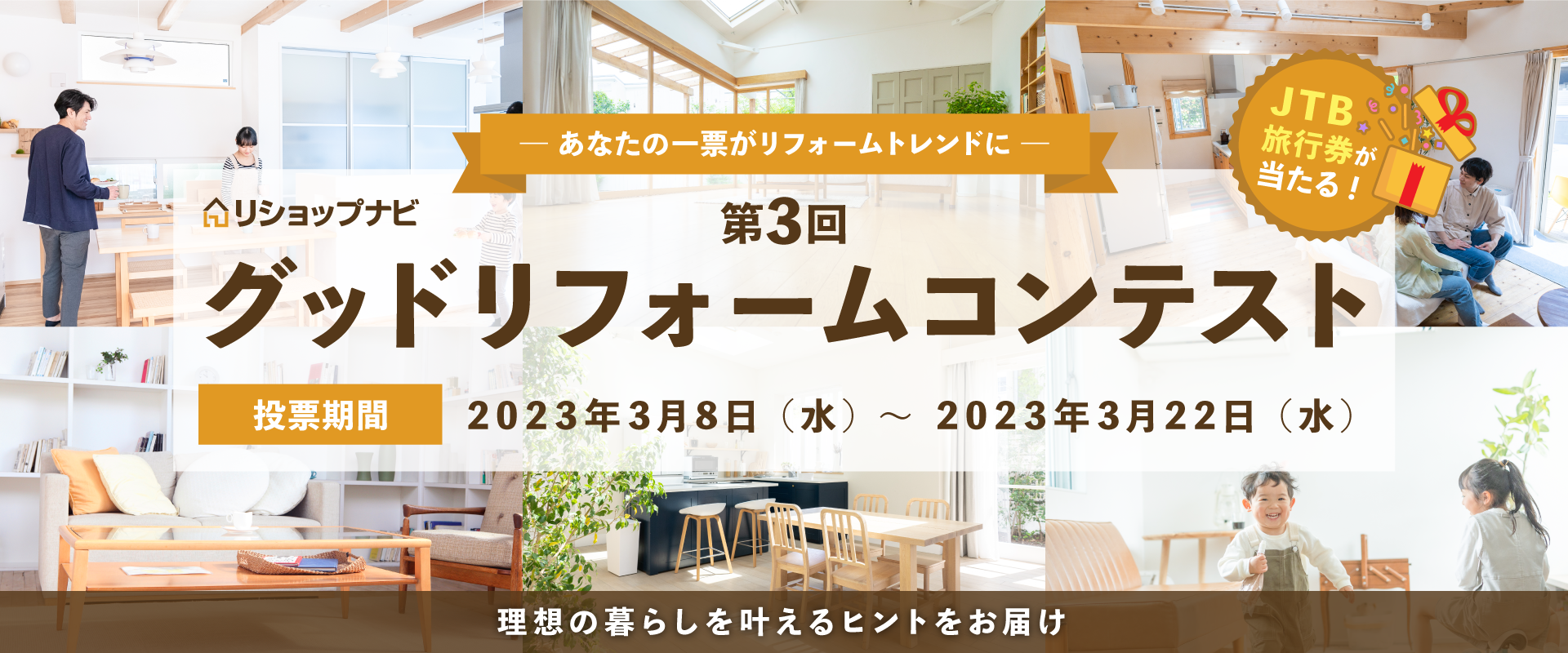 「リショップナビ グッドリフォームコンテスト」は、「次世代のリフォーム体験の創出」のために、厳格な加盟審査をクリアしたリフォーム会社をオンラインでご紹介する国内最大級のリフォーム会社マッチングサービス「リショップナビ」が運営するコンテストです。事務局が3,800社超の加盟店から暮らしをより良くする魅力的な施工事例を選出し、ノミネート事例からオンライン一般投票によって各グランプリ・準グランプリを決定いたします。また、一般投票およびツイッターキャンペーンにご参加いただいた方には、抽選で3名様にJTB旅行券20,000円分をプレゼントいたします。