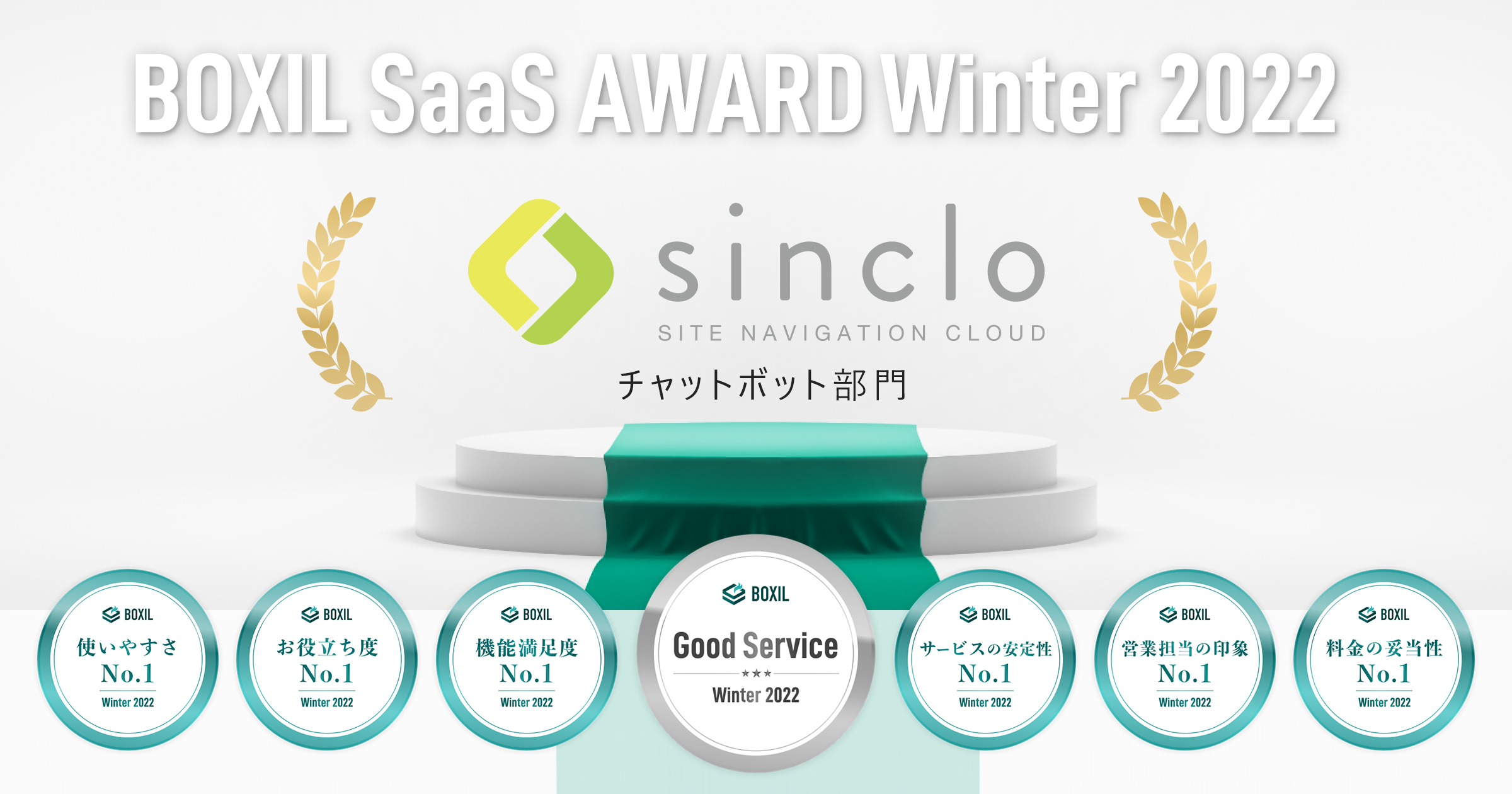 「BOXIL SaaS AWARD(ボクシル サース アワード)」は、スマートキャンプが運営するSaaS比較サイト「BOXIL SaaS(ボクシル サース)」が、優れたSaaSを審査、選考、表彰するイベントです。今回の「BOXIL SaaS AWARD Winter 2022」は、2021年10月1日から2022年9月30日までの1年間で新たに投稿された口コミ約10,000件を審査対象としており、「sinclo」は「チャットボット部門」で「Good Service」に選ばれました。また、その証となる「Good Serviceバッジ」が、スマートキャンプから付与されました。あわせて「使いやすさNo.1」「お役立ち度No.1」「機能満足度No.1」「サービスの安定性No.1」「営業担当の印象No.1」「料金の妥当性No.1」の6つのNo.1も獲得しています。
