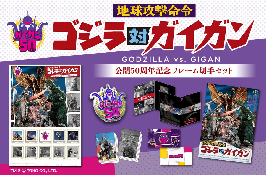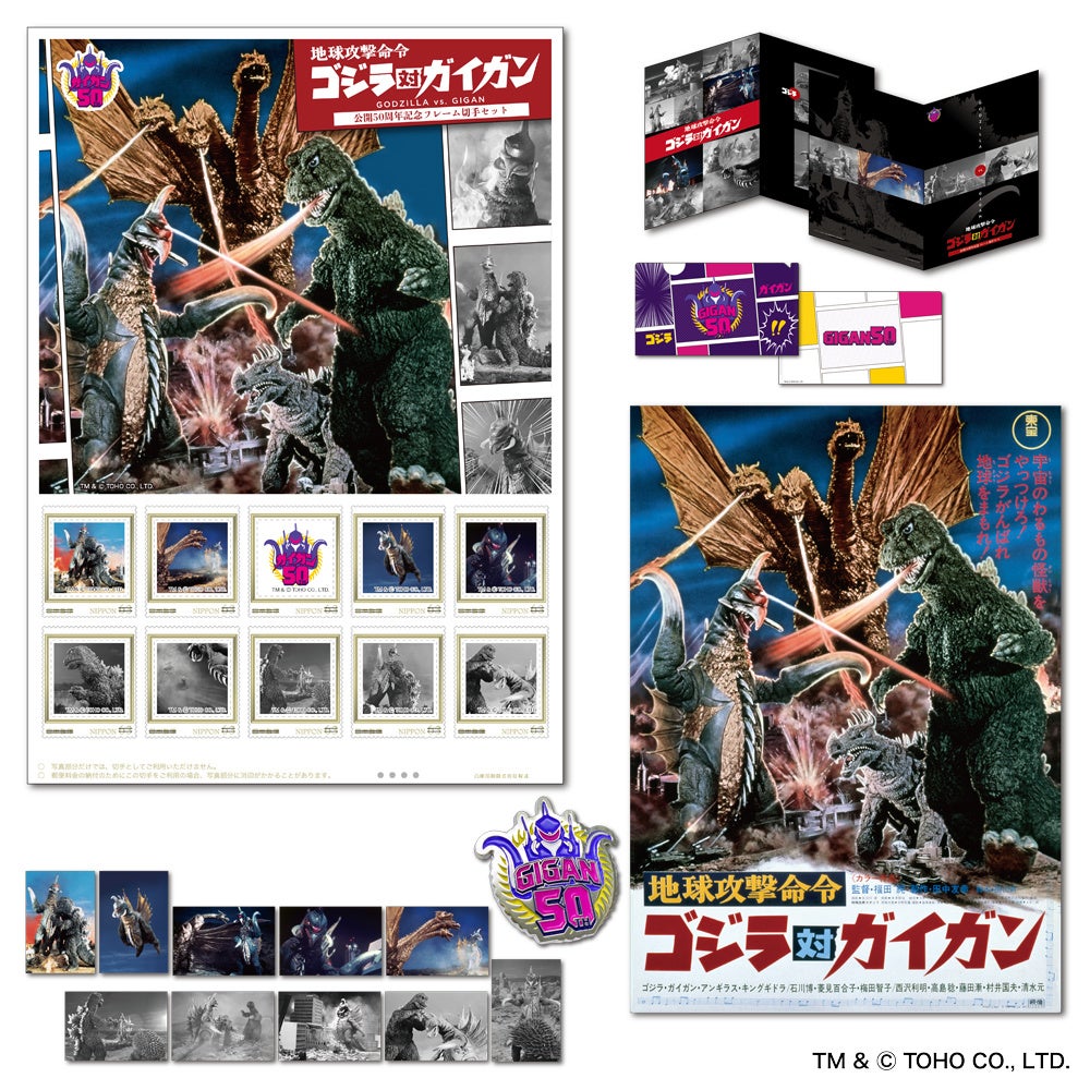 ゴジラシリーズの第12作目『地球攻撃命令 ゴジラ対ガイガン』の劇場公開50周年を記念したフレーム切手セットです。。劇中の名場面で構成されたフレーム切手シートやポストカードの他に、公開当時の宣伝ポスターの復刻版や公式のガイガン生誕50周年記念オリジナルデザインを使用したピンバッジなどをセットにした豪華な商品です。