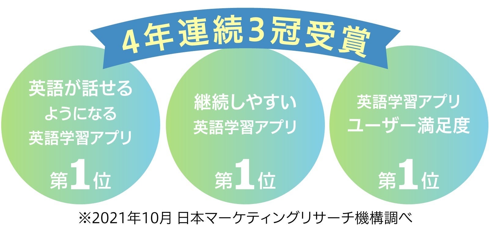 また、2021年10月には『英語能力の向上を実感できる英語学習アプリ第1位』『継続しやすい英語学習アプリ第1位』『英語学習アプリ ユーザー満足度第1位』に選ばれ、4年連続3冠を受賞しているサービスです。