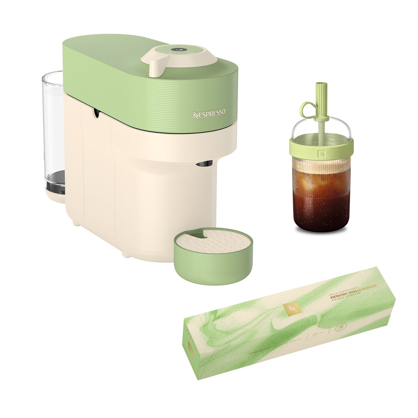 コーヒーメーカーは、ピスタチオカラーの「ヴァーチュオ ポップ」に「トラベル アイスコーヒー タンブラー ピスタチオ」、アイスレシピ専用コーヒー「ピスタチオ バニラ フレーバー オーバー アイス」をセットにし、5月下旬より特別価格で販売します。「ヴァーチュオ」はネスプレッソ独自の抽出方法「セントリフュージョン(遠心力抽出法)」を採用。ラージカップを中心に、たっぷりとしたクレマ(※2)と芳醇なアロマを合わせ持つ本格的なコーヒーをボタン一つで簡単に抽出できる「ヴァーチュオ」システムの中でも、「ヴァーチュオ ポップ」は日本の住環境にもフィットするミニマルなデザインとコンパクトなボディが魅力のコーヒーメーカーです。