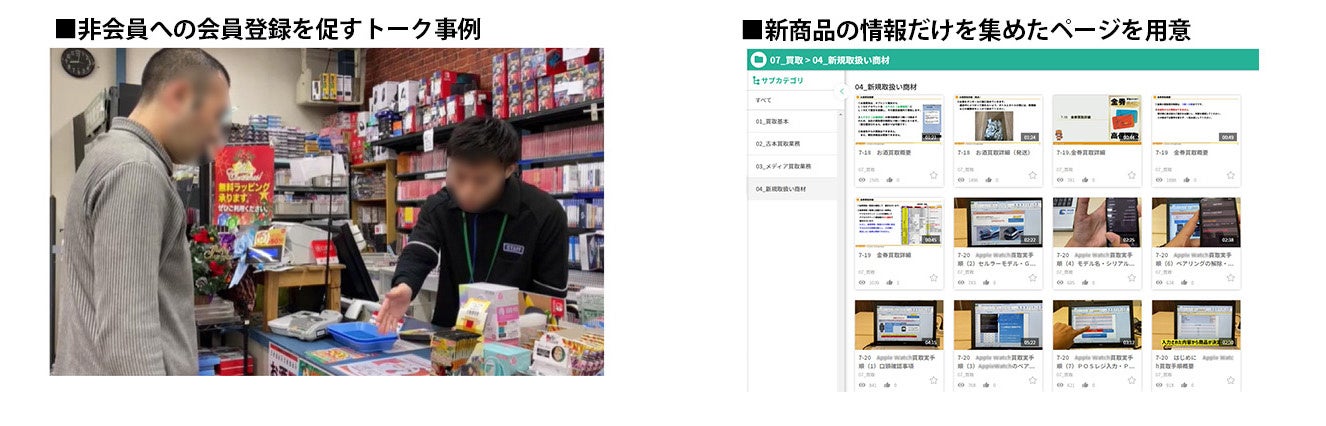 | 店長の業務負荷削減 | ・紙のマニュアルに代わり、商品やオペレーションに関わる業務を動画化。店長が教えなくてもスタッフが自律的に学習できる仕組みを構築。 従来の商材に加え、酒類、金券、ウェアラブル端末などの新商品を追加。 |