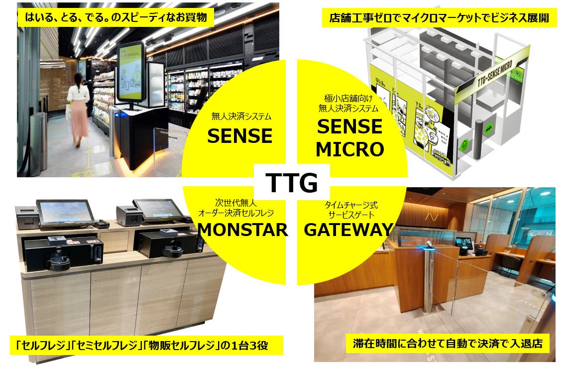 バリューデザインは、飲食・小売業界を中心に独自Pay(店舗独自のハウス電子マネー)の発行が可能な「Value Card」を提供しています。企業や店舗は、「Value Card」を導入することで、独自Payの特長である再来店強化、ロイヤルカスタマーの育成から売上拡大を見込めます。一方、TTGでは、飲食・小売業界に向けて、省人化のシステムソリューションの開発をおこなっています。現在、ウォークスルー型の無人決済店舗「TTG-SENSE」、極小店舗向け無人決済システム「TTG-SENSE MICRO」、多機能非対面オーダー決済端末「TTG-MONSTAR」、タイムチャージ式ゲート「TTG-GATEWAY」の4つのプロダクトを展開しています。