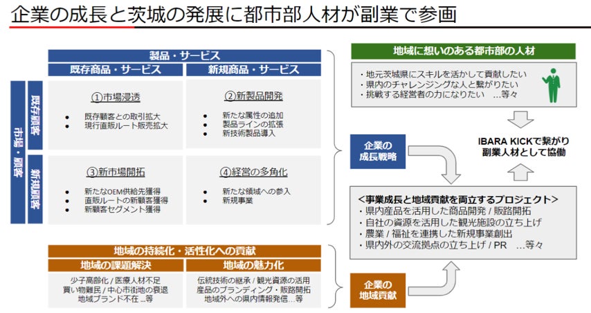 「iBARAKICK(イバラキック)」は、事業者の成長と地域課題解決の両立を目指す企業のプロジェクトに、主に都市部のスキルや経験を有する人材が副業として取り組むプログラムです。