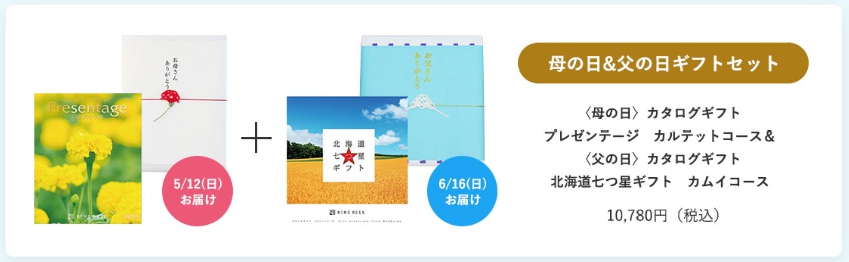 母の日が終わればすぐ父の日…とギフトの手配で慌ただしくなるこの季節。リンベルなら母の日・父の日ギフトの手配が一度でまとめて完了!お母さん、お父さんに好きなものを選んでいただけるカタログギフトのセットを2種ご用意しました。母の日は5月12日(日)、父の日は6月16日(日)にそれぞれお届けします。