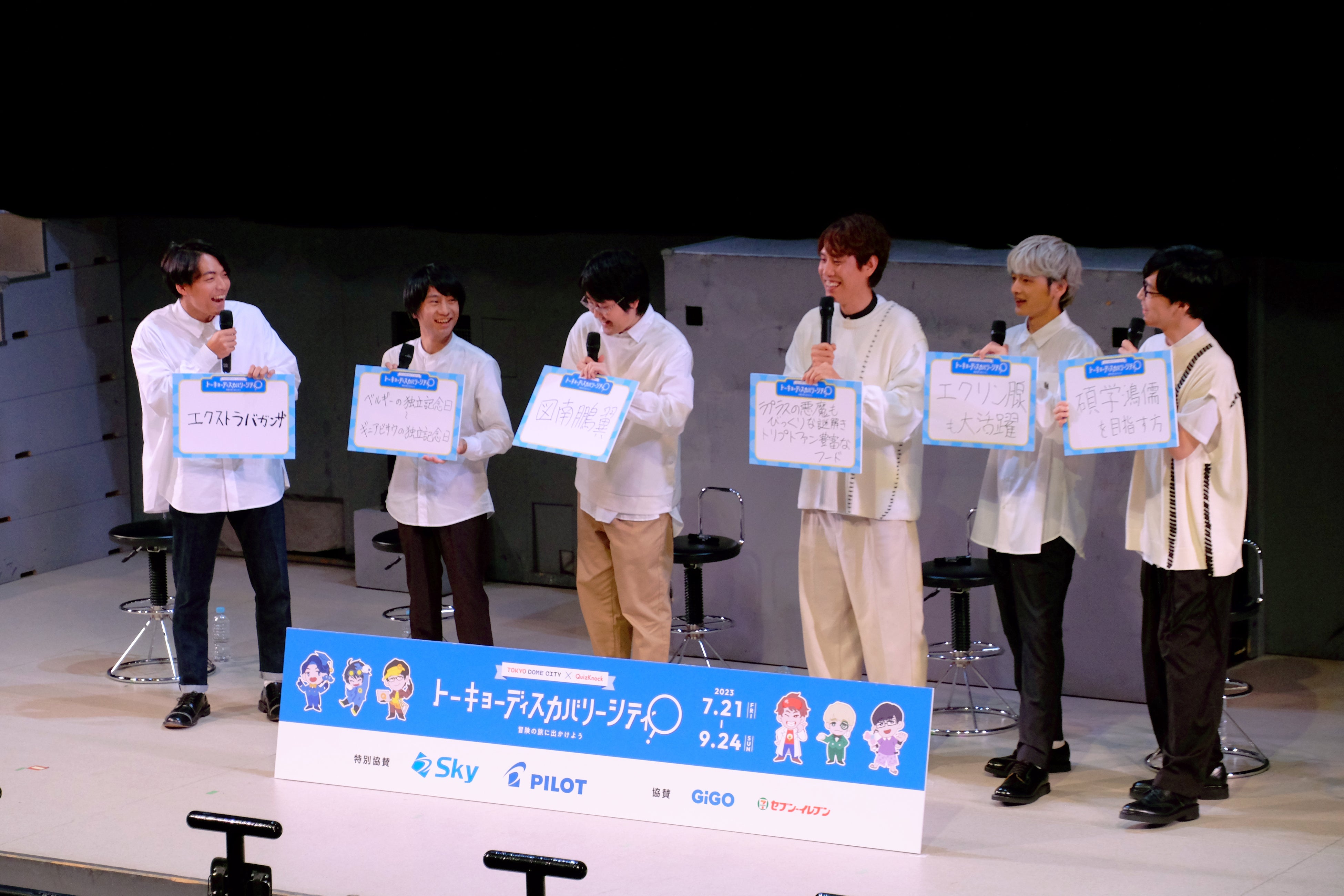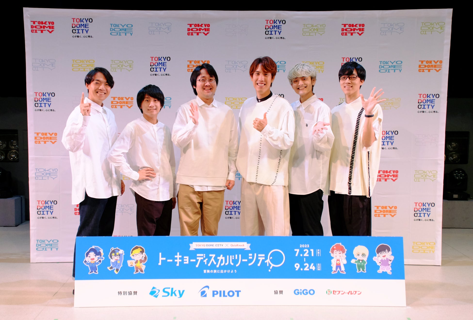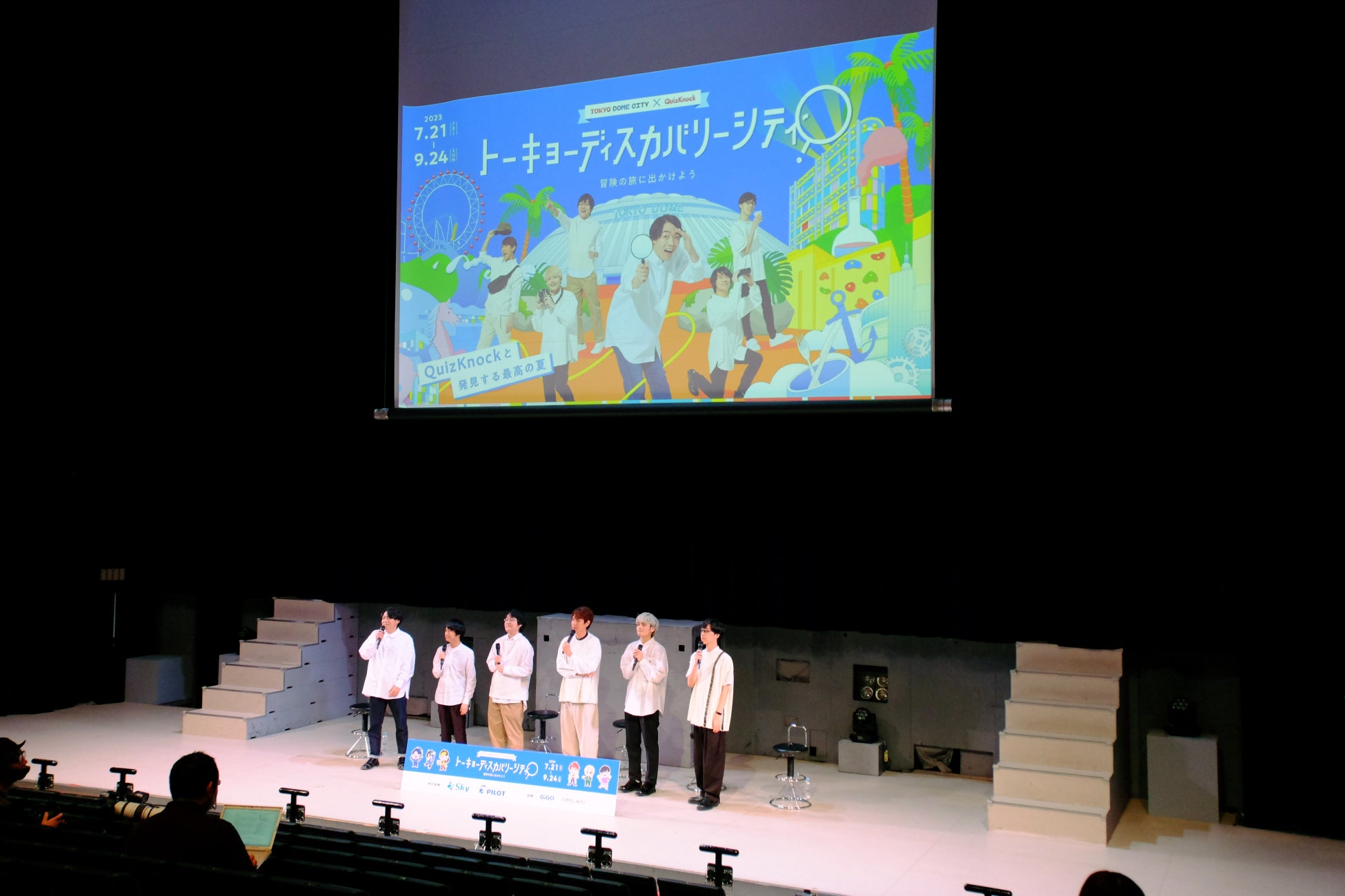 記者発表会には、QuizKnockから伊沢拓司、ふくらP、須貝駿貴、山本祥彰、鶴崎修功、乾の6名が登壇。駆け出しの研究者になりきってミッションをクリアしていく「トーキョーディスカバリーシティ!」のストーリーや、遊園地謎解きゲームを始めとする、この夏イチオシのコンテンツについて紹介しました。