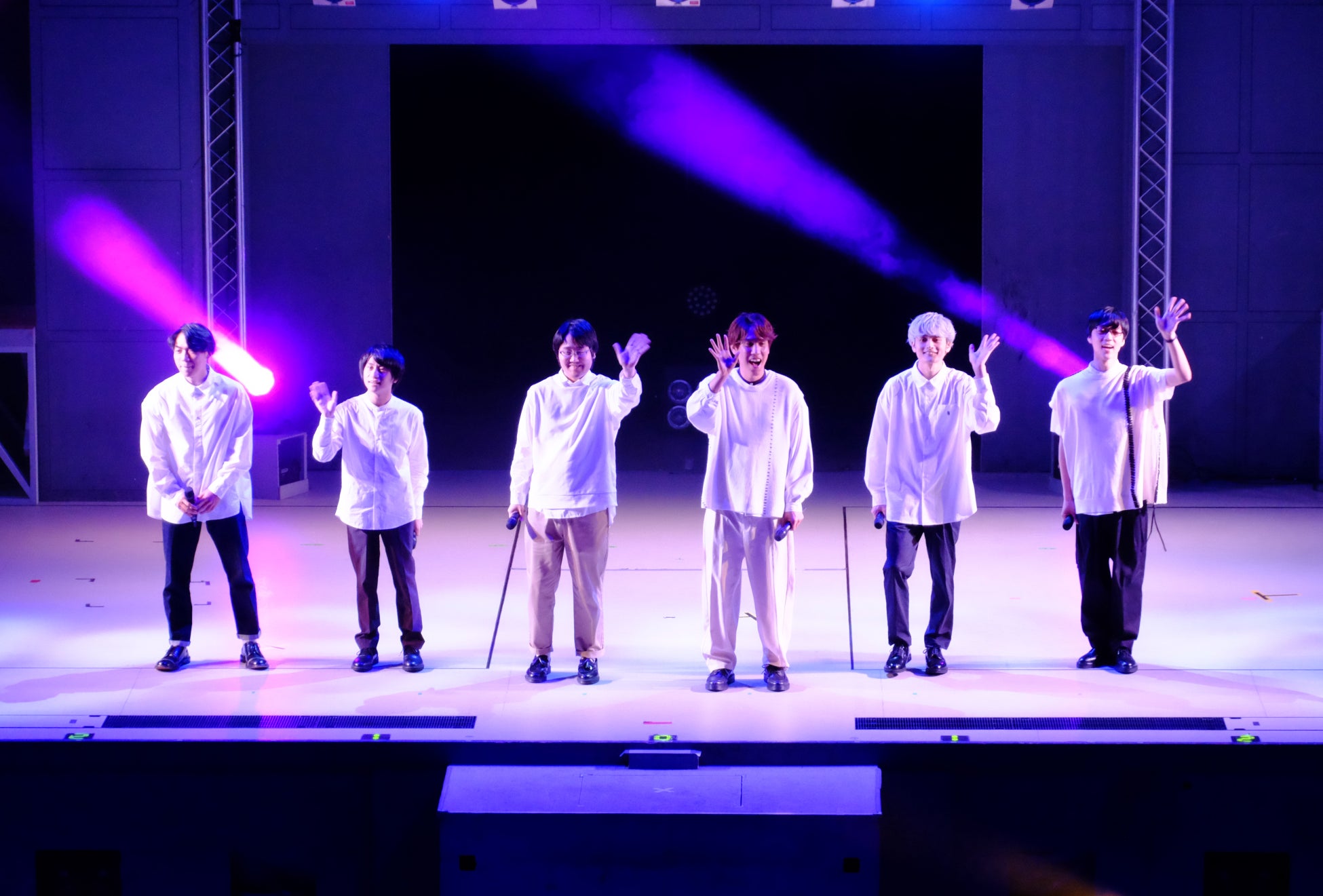 記者発表会は、ステージ上に投影されたオープニング映像とともに始まりました。映像では本イベントのテーマソングである「アタシ」(作詞・作曲:syudou)をBGMに、記者発表会に登壇する6名のQuizKnockメンバーを紹介。映像が終わると幕があがり、QuizKnockの伊沢拓司、ふくらP、須貝駿貴、山本祥彰、鶴崎修功、乾が登場しました。