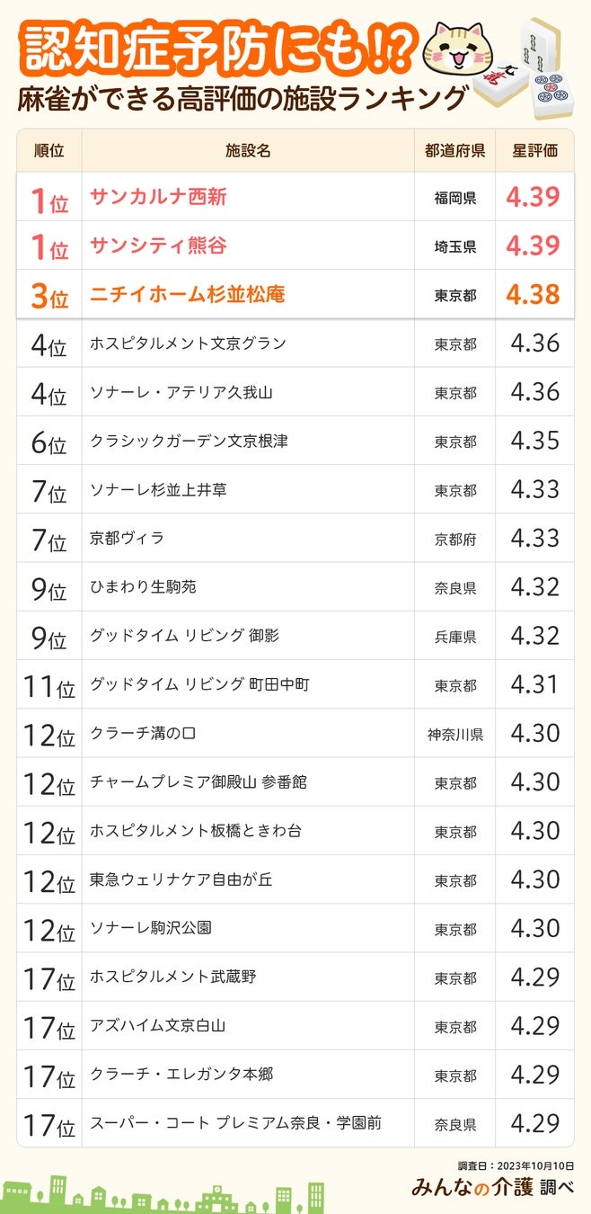 ギャンブルのイメージが強い⿇雀ですが、現在は認知症予防や⽼化防⽌に効果があるとして注⽬を集めています。 そのため、レクリエーションの一環として賭け事なしの⿇雀を採⽤する施設が増えてきており、 全国には⿇雀を取り入れている⽼⼈ホームが1,327件あります。 そこで今回は、「⿇雀」を楽しめる全国の介護施設を、 「みんなの介護サイト」内での星評価・点数を⽤いたランキング形式でご紹介します。