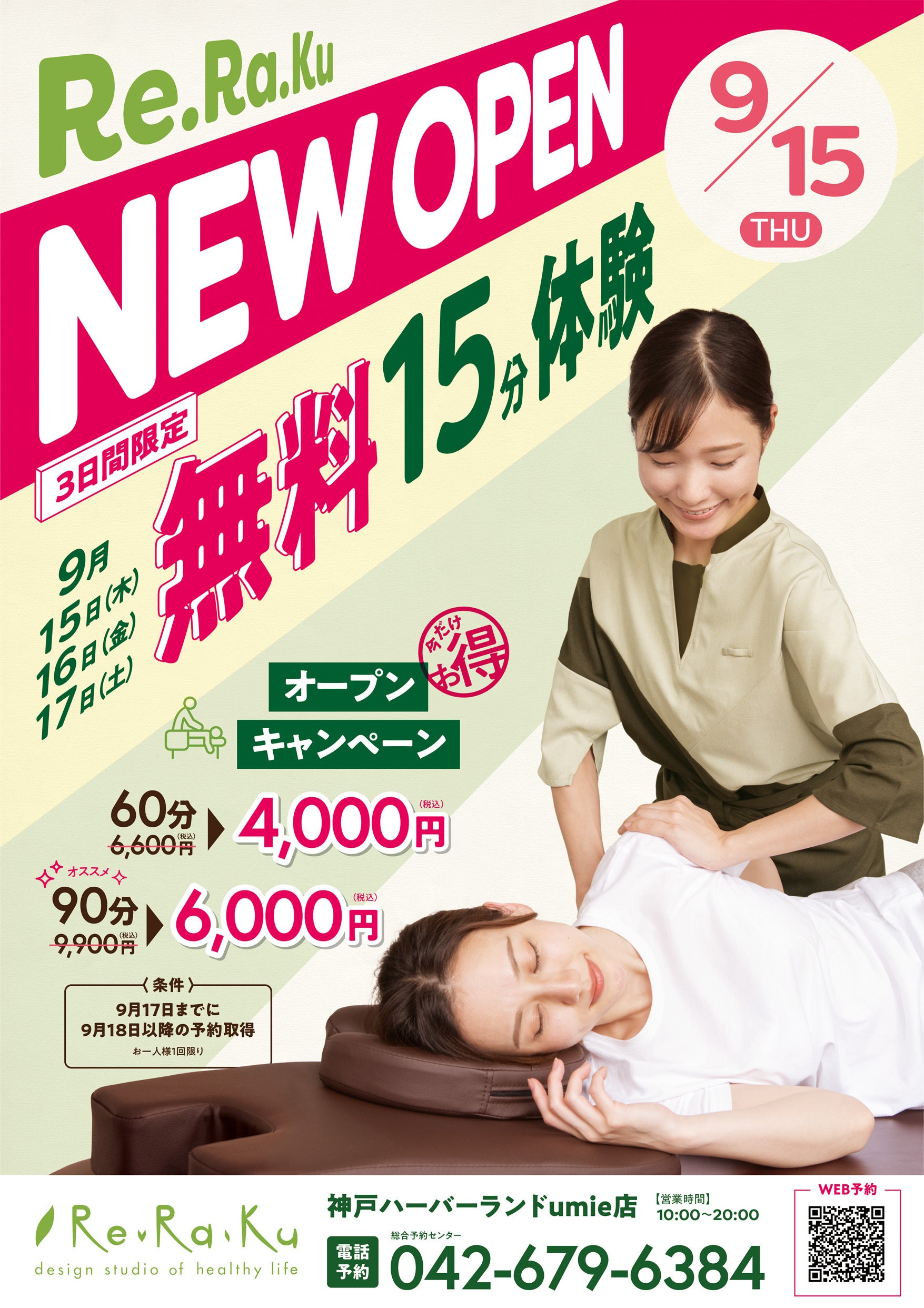 リラクゼーションスタジオRe.Ra.Ku (リラク)神戸ハーバーランドumie店が9月15日オープン!