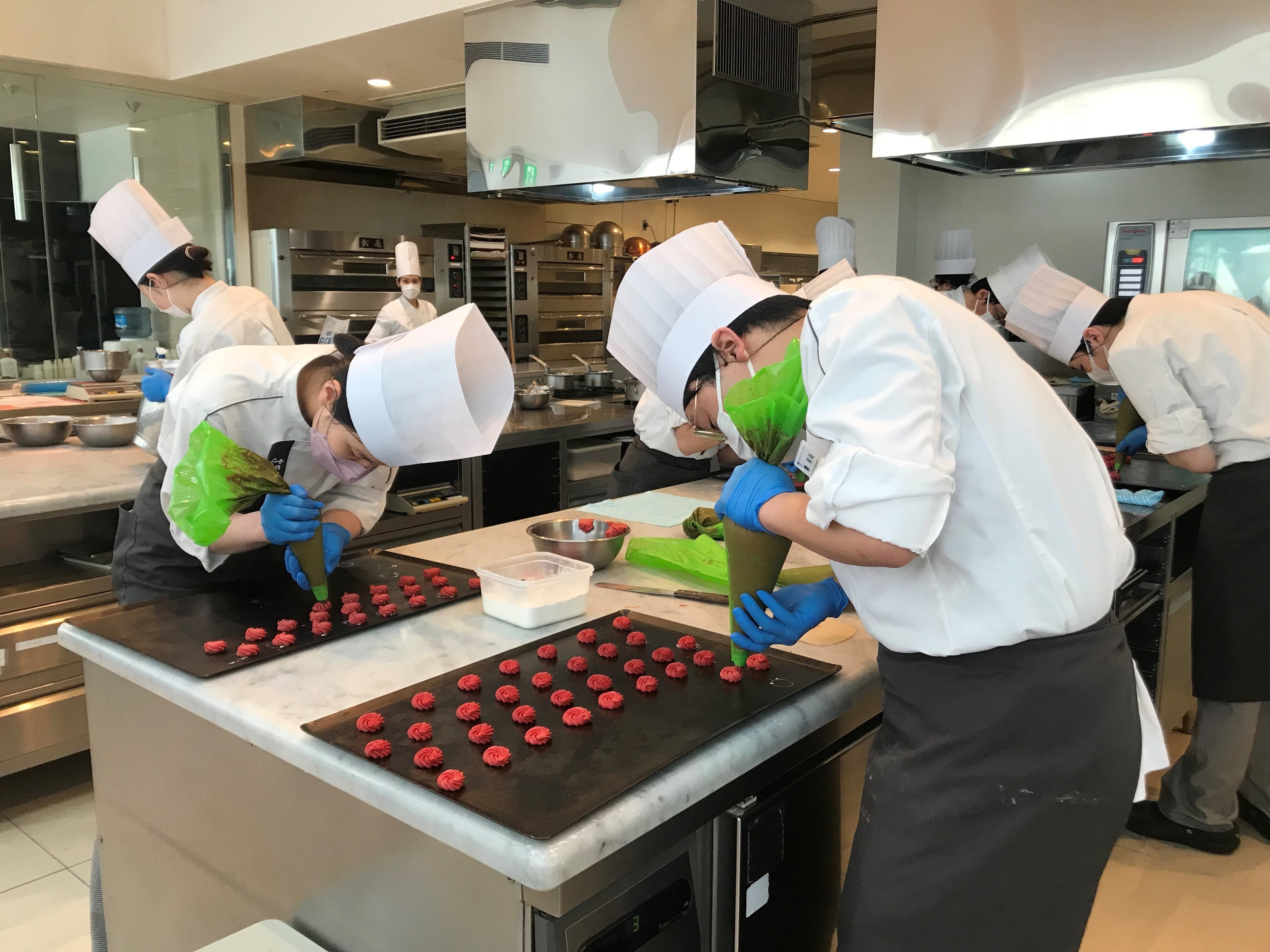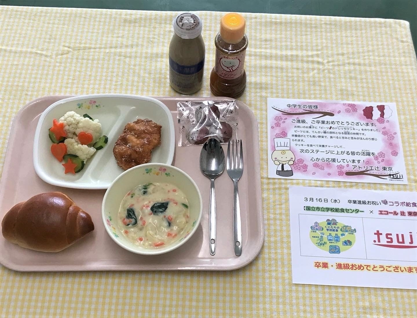 食のプロを育成する教育機関 エコール 辻󠄀 東京(東京都国立市、校長:百野浩史、辻󠄀調グループ)は、国立市立学校給食センターとのコラボレーション企画で、同市内にある市立中学校3校の全生徒を対象に、卒業や進級のお祝い献立として「お祝いクッキー」1500人分を提供しました。中学3年生の最後の給食日にあたる3月16日には、本校の学生が市立国立第一中学校にお邪魔して、クッキーの製造工程をまとめたビデオを各教室で上映し、お祝いメッセージも添えました。