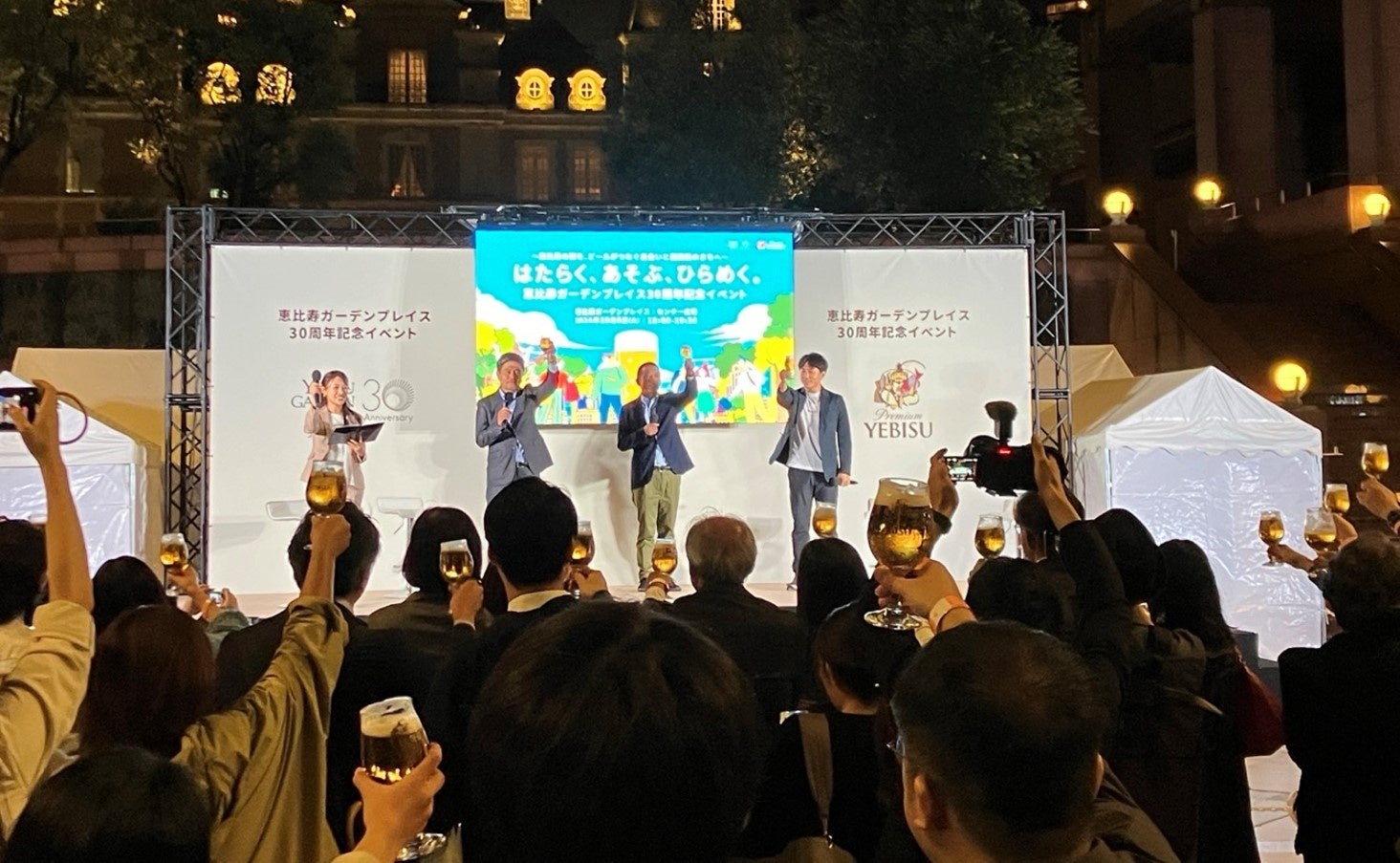 オフィスで働く人が中心となって、ホップの栽培や醸造体験を通してビールの理解を深めつつ、参加型のワークショップでコンセプトやデザインを考案し、恵比寿ガーデンプレイスの30周年記念ビールを開発しました。完成したビールは恵比寿ガーデンプレイス開業の日である10月8日にお披露目され、恵比寿のまちの皆さんと乾杯しました。