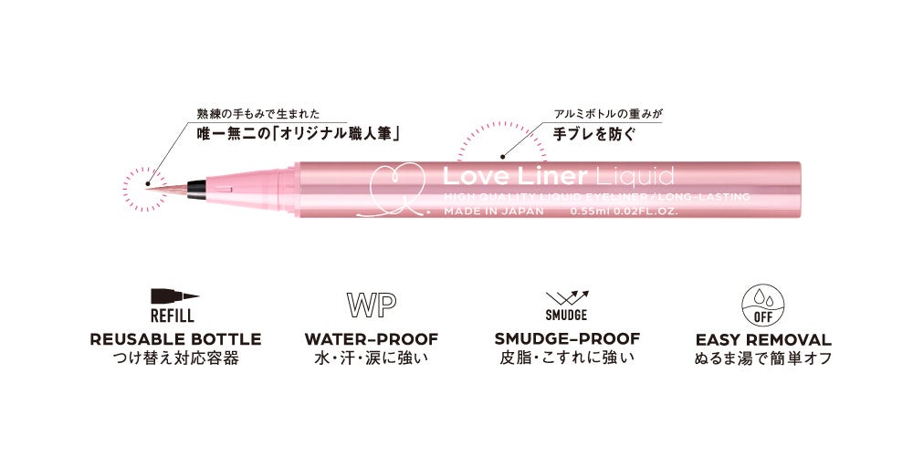 水・汗・涙に強いウォータープルーフ&皮脂・こすれに強いスマッジプルーフ仕様なのにぬるま湯で簡単にオフすることができる、アイライナー売上No.1※2のラブ・ライナー リキッド。今回PLAZA・MINiPLA限定で発売するオリジナルカラーは、涙袋をぷっくりみせたり、二重ラインを自然に強調できる影色ライナーです。クマにみせないシアーローズピンクで、目元に血色感を与えます。