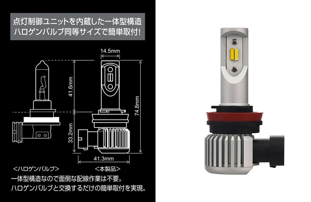 点灯制御ユニットを内蔵した一体型。純正ハロゲンバルブ同等のコンパクトサイズにすることで、バルブを入れ替えるだけの簡単取り付けを可能にし、幅広い車種への適合に対応しました(下図左)。また、純正フォグランプスイッチのON/OFF操作で発光色を簡単に切り替えできます。