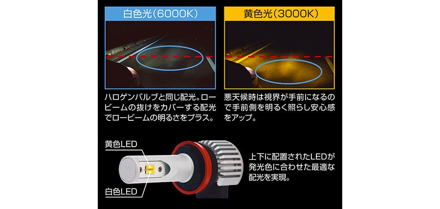 悪路が見やすい配光のバイカラー&明るさを追求したイエロー光 2種類のLEDフォグバルブ発売|GIGA