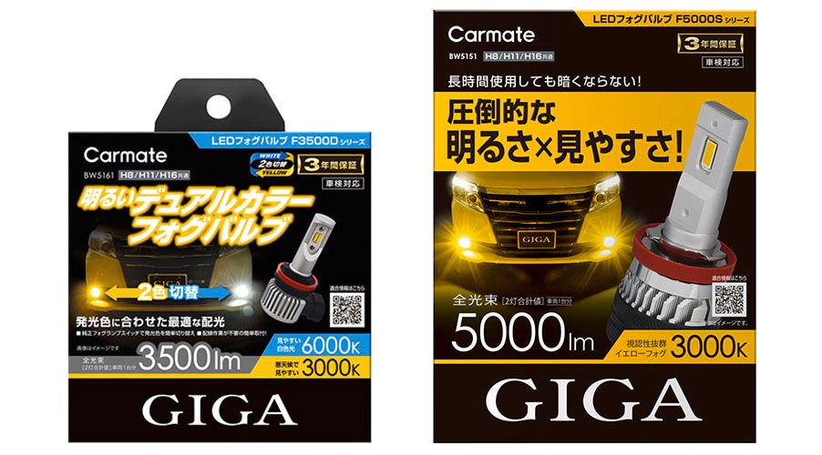 株式会社カーメイト(本社:東京都豊島区)は、自動車用ライトブランド『GIGA(ギガ)』より、発光を2色に切り替えられるLEDフォグバルブと、『S7シリーズ※』の放熱構造を活用した黄色光LEDフォグバルブを11月25日(金)に発売いたしました。明るさにこだわった2種類のハロゲンバルブ交換用LEDフォグバルブで、冬の悪天候等のドライブをサポートします。各製品の詳細は以下をご覧ください。