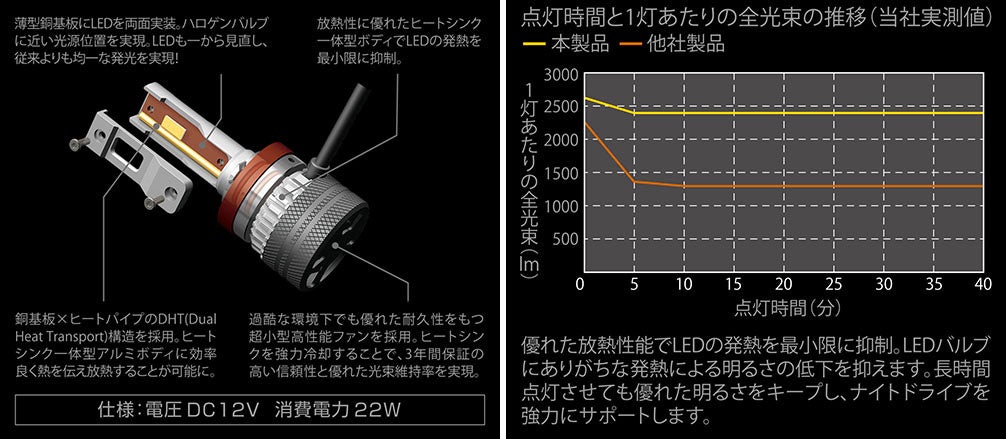 2020年6月の発売以降好調の、コンパクトサイズかつハイパワーなLEDバルブ『S7シリーズ(https://www.carmate.co.jp/news/press/giga-2.html)』。本製品では、明るさに定評のあるS7シリーズと同様の銅基板×ヒートパイプの構造を採用しました。また、小型冷却ファンを搭載し、ヒートシンクに溜まった熱を素早く冷却することで高い光束維持率(下図:40分後の光束維持率約94%)を実現します。