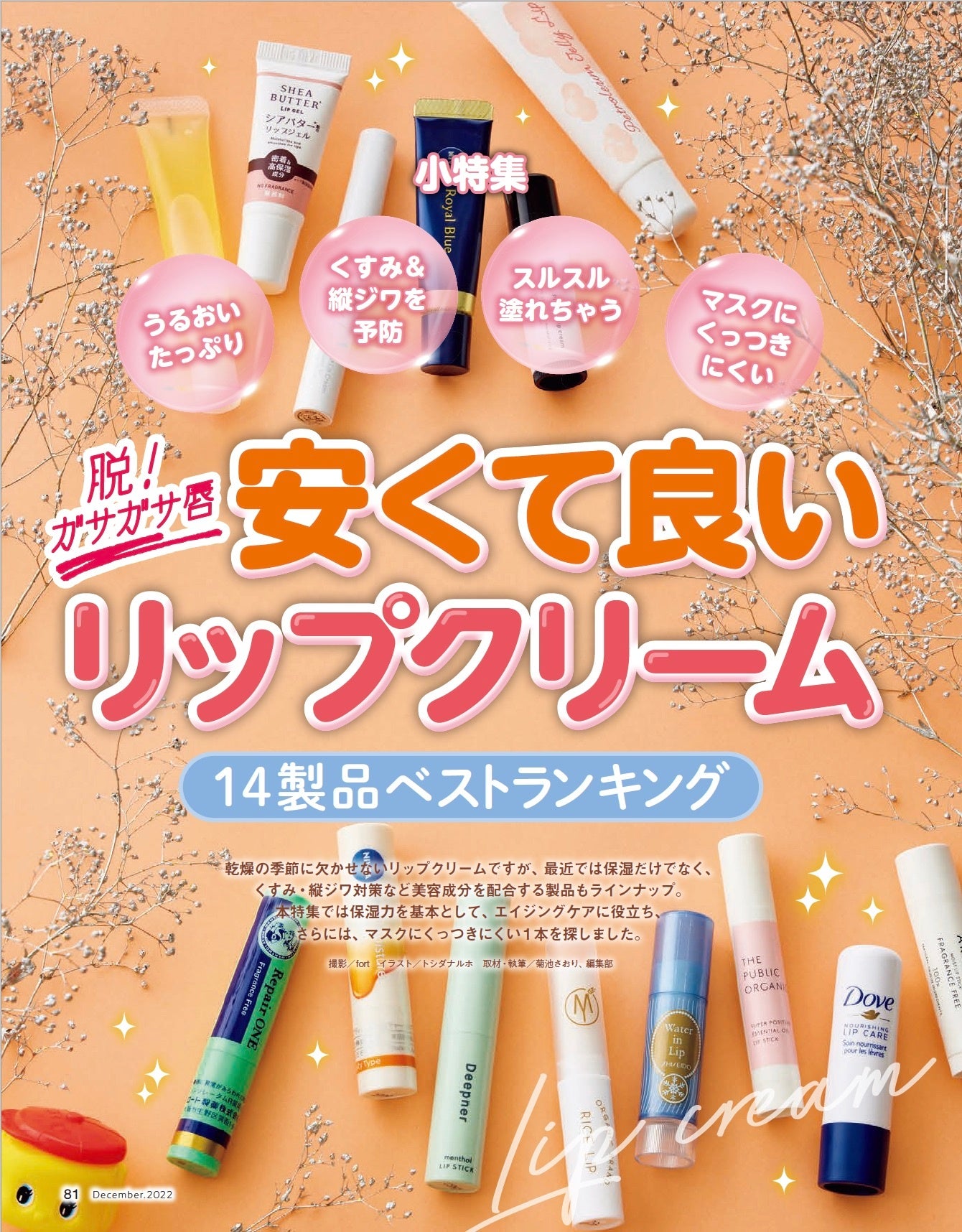 乾燥の季節に欠かせないリップクリームですが、最近では保湿だけでなく、くすみ・縦ジワ対策など美容成分を配合する製品もラインナップ。本特集では保湿力を基本として、エイジングケアに役立ち、さらには、マスクにくっつきにくい1本を探しました。