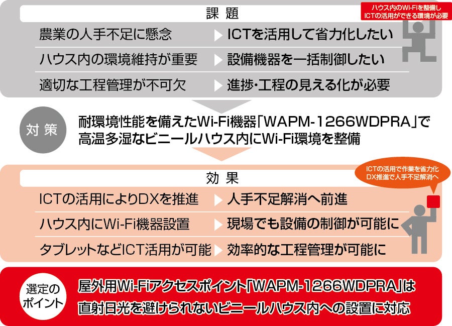 バッファローの法人向けWi-Fiアクセスポイントが、高温多湿・直射日光のビニールハウスにて採用されました