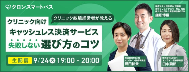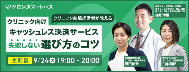 ◆クリニック向けウェビナー 「クリニック敏腕経営者が教える、キャッシュレス決済サービスの、失敗しない選び方のコツ」を9/24(火)開催!